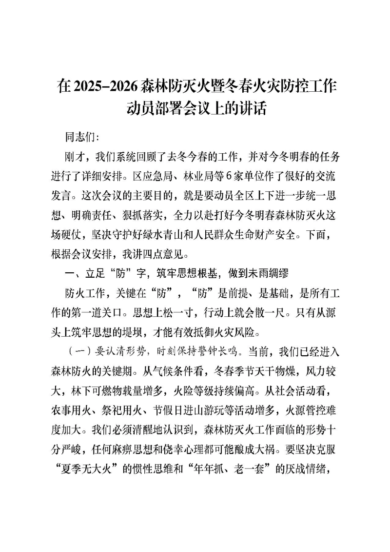 在2025-2026森林防灭火暨冬春火灾防控工作动员部署会议上的讲话同志们:刚才,我们系统回顾了去冬今春的工作,并对今冬明春的任务进行了详细安排。区应急局、林业局等6家单位作了很好的交流发言。这次会议的主要目的,就是要动员全区上下进一步统一思想、明确责任、狠抓落实,全力以赴打好今冬明春森林防灭火这场硬仗,坚决守护好绿水青山和人民群众生命财产安全。下面,根据会议安排,我讲四点意见。一、立足“防”字,筑牢思想根基,做到未雨绸缪防火工作,关键在“防”,“防”是前提、是基础,是所有工作的第一道关口。思想上松一寸,行动上就会散一尺。只有从源头上筑牢思想的堤坝,才能有效抵御火灾风险。(一)要认清形势,时刻保持警钟长鸣。当前,我们已经进入森林防火的关键期。从气候条件看,冬春季节天干物燥,风力较大,林下可燃物载量增多,火险等级持续偏高。从社会活动看,农事用火、祭祀用火、节假日进山游玩等活动增多,火源管控难度加大。我们必须清醒地认识到,森林防灭火工作面临的形势十分严峻,任何麻痹思想和侥幸心理都可能酿成大祸。要坚决克服“夏季无大火”的惯性思维和“年年抓、老一套”的厌战情绪,真正从内心深处重视起来,把形势估计得更严峻一些,把困难考虑得更充分一些,把准备工作做得更扎实一些,宁可十防九空,不可失防万一。(二)要厘清职责,坚决扛起政治责任。森林防灭火实行的是行政首长负责制。各乡镇(街道)、各成员单位的主要领导是本辖区、本领域防火工作的第一责任人,要亲自抓、负总责;分管领导是直接责任人,要具体抓、抓落实。要进一步细化责任分工,将责任层层分解到具体岗位、具体人头,落实到每个山头、每片林地,真正做到“山有人管、林有人护、责有人担”。要健全完善横向到边、纵向到底的责任体系,确保各个层级、各个环节都有人负责、有人管事,绝不能在责任落实上出现“空档”和“盲区”。要严格执行“党政同责、一岗双责、齐抓共管、失职追责”的要求,对因责任不落实、措施不到位导致发生火灾的,要严肃追责问责。(三)要深化认识,牢固树立正确政绩观。森林资源是宝贵的自然财富,是生态文明建设的重要载体,保护森林资源就是保护生产力,就是保护我们赖以生存的家园。做好森林防灭火工作,不仅是一项重要的业务工作,更是一项严肃的政治任务。要牢固树立“绿水青山就是金山银山”的理念,深刻认识到森林火灾对生态环境的破坏是毁灭性的,对人民群众生命财产的威胁是巨大的。必须站在对党负责、对人民负责、对历史负责的高度,以“时时放心不下”的责任感,把森林防灭火工作抓实抓细抓好,切实保护好我们来之不易的生态建设成果,绝不能以牺牲生态环境为代价换取一时一地的经济发展。二、聚焦“宣”字,营造浓厚氛围,凝聚全民共识宣传教育是森林防火的第一道防线。群众是防火工作的主体,也是战胜火灾的强大力量。只有广泛发动群众、依靠群众,提高全民防火意识和法治观念,才能形成群防群治、人人有责的良好局面。(一)要拓宽渠道,实现宣传全域覆盖。要改变过去单一、刻板的宣传模式,充分利用现代传媒和传统手段相结合的方式,构建“线上+线下”的全方位宣传矩阵。线上要发挥好微信群、短视频平台(如抖音)等新媒体传播快、覆盖广的优势,制作推送群众喜闻乐见的防火宣传短片、警示案例。线下要持续运用好应急大喇叭、宣传车、悬挂横幅、设置固定防火牌、发放宣传明白卡、开展防火宣传“六进”(进林区、进学校、进集镇、进村屯、进机关、进社区)活动等传统有效方法,把防火知识送到田间地头、送到农户家中。要确保宣传到村、到户、到人,特别是要对重点人群进行针对性宣传,消除宣传死角和盲区。(二)要丰富内容,提升宣传警示效果。宣传内容要贴近实际、贴近生活、贴近群众。不仅要宣传森林防火的政策法规、基本知识,还要大力宣传安全用火、紧急避险常识;不仅要宣传保护森林的重要意义,还要宣传引发火灾的法律责任和严重后果。要突出以案说法、以案示警,精选本地或周边地区发生的典型火灾案例,深入剖析原因,讲清危害,用身边事教育身边人,让群众直观感受到火灾就在眼前、教训就在身边,从而达到“查处一人、警示一批、教育一片”的效果。临近清明等传统祭祀节日时,要重点加强文明祭祀宣传,引导群众移风易俗。(三)要突出重点,盯紧看牢特殊人群。宣传教育工作不能“大水漫灌”,要精准施策。要加强对儿童、中小学生等重点群体的防火安全教育,通过上好防火课等方式,提高他们的防火意识和自防自救能力。要特别重视对痴、呆、聋、哑、精神病等特殊人群以及老年人的监管和宣传,要逐一摸排建档,明确监护人,落实监护责任,通过上门走访、签订责任状等方式,确保监管到位,防止因监管不力而引发火灾。对进入林区的施工人员、游客等,也要加强宣传和教育,严格火源管理。三、着力“严”字,狠抓源头管控,消除风险隐患火源管理是森林防火的核心环节。管不住火源,一切都是空谈。必须采取最严格的措施,