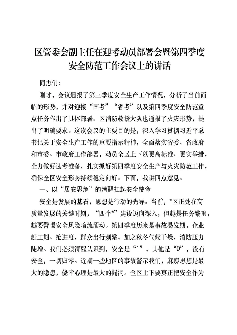 区管委会副主任在迎考动员部署会暨第四季度安全防范工作会议上的讲话同志们:刚才,会议通报了第三季度安全生产工作情况,分析了当前面临的形势,并对迎接“国考”“省考”以及第四季度安全防范重点任务作出了具体部署。区消防救援大队也通报了火灾形势,提出了明确要求。这次会议的主要目的是,深入学习贯彻习近平总书记关于安全生产工作的重要指示精神,全面落实省委、省政府和市委、市政府工作部署,动员全区上下以更高标准、更实举措,全力做好迎考准备,扎实抓好第四季度安全生产与火灾防范工作,确保全区安全形势持续稳定向好。下面,我讲四点意见。一、以“居安思危”的清醒扛起安全使命安全是发展的基石,思想是行动的先导。当前,*区正处在高质量发展的关键时期,“四个*”建设迈向深入,但越是任务繁重,越要警惕安全风险暗流涌动。第四季度历来是事故易发期,企业赶工期、抢进度,群众出行频繁,加之秋冬气候干燥,消防压力陡增。我们必须清醒认识到,安全是“1”,其他是“0”,没有安全,一切归零。近期一些地区的事故警示我们,麻痹思想是最大的隐患,侥幸心理是最大的漏洞。全区上下要真正把安全作为政治任务和民生工程,以“时时放心不下”的责任感,筑牢思想防线,守住安全底线。(一)要提升政治站位的“高度”,解决“为何抓”的认识问题。安全生产是“国之大者”,关乎人民群众生命财产安全,关乎高质量发展大局。习近平总书记多次强调“发展决不能以牺牲安全为代价”,这要求我们必须从政治上看安全、从大局上抓安全。*区作为经济主战场,安全水平直接关系区域形象和投资环境。各级干部要深刻认识到,抓安全就是讲政治、就是促发展、就是保民生。不能把安全视为一般性工作,而要作为检验“两个维护”的经验交流。比如,西安*区在建设“四个*”时,将安全融入“实力*”“品质*”战略,实现了发展与安全良性互动。我们要学习这种理念,把安全责任扛在肩上、抓在手上。(二)要增强规律把握的“深度”,解决“怎么抓”的方法问题。安全不是“头痛医头”,而要把握其内在规律。事物发展都有因果链,事故背后必有隐患。我们要运用系统思维,把握安全生产的周期性、关联性特点。第四季度企业生产进入旺季,人流物流集中,风险叠加放大。就像开车下坡,越到陡坡越要踩刹车。要结合季节特点,针对建筑施工高处作业、危化品仓储运输、消防通道堵塞等风险,提前研判,精准施策。学习浙江省“全面排查风险、整治隐患、扫除盲区”的经验,做到预防在先、发现在早、处置在小。(三)要拓宽群众参与的“广度”,解决“靠谁抓”的主体问题。安全为了人民,安全依靠人民。群众是风险的最先感知者,也是防控的第一道关口。要广泛发动企业职工、社区居民参与隐患排查,打造“人人有责、人人尽责”的安全共同体。比如,一些地区设立“安全吹哨人”制度,鼓励群众举报隐患,效果显著。我们要推广这种模式,利用新媒体开展安全宣传,让安全知识进企业、进社区、进家庭。通过案例警示、应急演练,提升群众自救互救能力,变“要我安全”为“我要安全”。(四)要强化危机意识的“锐度”,解决“抓多久”的韧劲问题。安全只有起点,没有终点。不能会议一开就松懈,检查一来就紧张。要有“永远在路上”的执着,时刻保持如履薄冰的警觉。历史上,许多事故都因“习惯性麻痹”酿成。就像煮青蛙,水温慢慢升高,青蛙不觉危险,最终丧命。我们要以“一日无为、三日不安”的心态,天天抓、时时盯。借鉴无锡*区“奋战四季度”的劲头,把安全纳入日常考核,形成常态化机制。二、以“精准拆弹”的举措破解安全难题攻坚重在精准,提效贵在务实。第四季度工作头绪多、任务重,迎考在即,必须抓住主要矛盾,聚焦重点领域,以“钉钉子”精神破解难题。就像医生治病,要找准病灶、开对药方。*区产业聚集,建筑施工、危化品、工贸企业风险突出,消防基础仍有短板。我们要坚持问题导向,瞄准“国考”“省考”标准,打好隐患排查歼灭战,确保风险可控、事故可防。(一)要打好重点领域“攻坚战”,解决“抓什么”的靶向问题。建筑施工要以防高处坠落、坍塌为重点,严格落实岗前培训、技术交底、设备检查措施。危化品领域要管住储存、运输、使用环节,推进自动化改造和智能监控。工贸企业要严查有限空间、涉爆粉尘风险,杜绝违规作业。消防方面要持续推进电动自行车、燃气管道专项整治,打通“生命通道”。这些领域是事故高发区,也是迎考关键点。要学习苏州吴中开发区“分类整治、闭环管理”的经验,对隐患挂牌督办,整改不到位不放过。(二)要提升迎考准备“精细度”,解决“怎么考”的应对问题。“国考”“省考”是对我们工作的全面检验,不能临时抱佛脚。要对照考核细则,逐条梳理台账,补齐短板。比如,一些地区因资料不全、现场混乱被扣分。我们要组织模拟检查,邀请专家预审,做到“心中有数、手中有招”。考核不是目的,而是提升工作的契机。要把迎考过程作为改进工作的过程,以考促建、以考促改。西安*