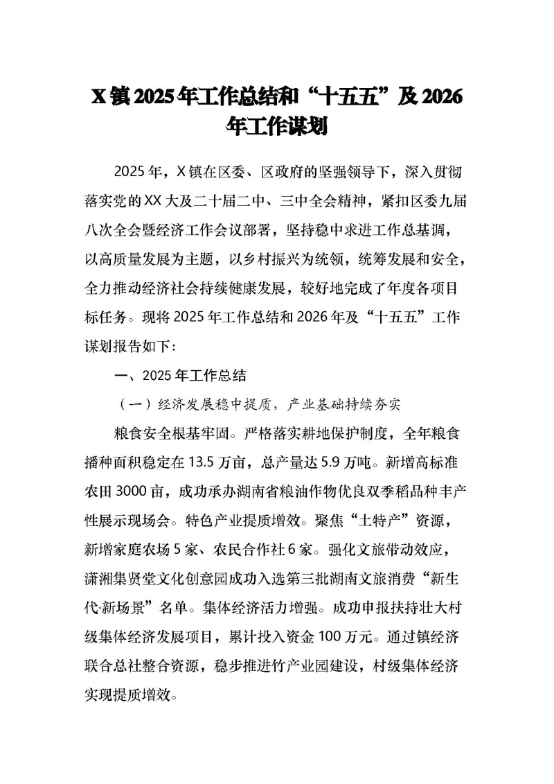 X镇2025年工作总结和“十五五”及2026年工作谋划2025年,X镇在区委、区政府的坚强领导下,深入贯彻落实党的XX大及二十届二中、三中全会精神,紧扣区委九届八次全会暨经济工作会议部署,坚持稳中求进工作总基调,以高质量发展为主题,以乡村振兴为统领,统筹发展和安全,全力推动经济社会持续健康发展,较好地完成了年度各项目标任务。现将2025年工作总结和2026年及“十五五”工作谋划报告如下:一、2025年工作总结(一)经济发展稳中提质,产业基础持续夯实粮食安全根基牢固。严格落实耕地保护制度,全年粮食播种面积稳定在13.5万亩,总产量达5.9万吨。新增高标准农田3000亩,成功承办湖南省粮油作物优良双季稻品种丰产性展示现场会。特色产业提质增效。聚焦“土特产”资源,新增家庭农场5家、农民合作社6家。强化文旅带动效应,潇湘集贤堂文化创意园成功入选第三批湖南文旅消费“新生代·新场景”名单。集体经济活力增强。成功申报扶持壮大村级集体经济发展项目,累计投入资金100万元。通过镇经济联合总社整合资源,稳步推进竹产业园建设,村级集体经济实现提质增效。(二)乡村振兴扎实推进,人居环境显著改善防返贫机制持续巩固。动态监测177户394名监测对象,落实交通补贴1619人、产业奖补423户、雨露计划216人次,消除返贫风险13户43人,守住不发生规模性返贫底线。乡村建设提质升级。完成农村危房改造2户,整治空心房856栋,恢复耕地554亩,完成“旱改水”75亩。新增高效节水灌溉面积6780亩,新修机耕道64.62千米。治理效能持续提升。推广“屋场会”“乡村合议庭”等基层治理模式,全年调处矛盾纠纷70余件。成功创建“无毒村(社区)”12个。(三)民生福祉持续增进,社会大局和谐稳定社会保障兜牢底线。发放农村及城市低保、残疾人两项补贴、特困人员供养、临时救助等保障金共计898.08万元。。公共服务优化升级。完成易地扶贫搬迁安置点道路拓宽与饮用水改造工程,惠及140余户群众。成立老年互助社结对帮扶近400名高龄老人。创新“1+1+1+N”家庭医生签约模式,开展健康体检公益行动,惠及4500余人。安全底线筑牢筑实。开展安全生产、消防等各类检查整治行动117次,排查整改安全隐患点91处。劝返核减滞留境外涉诈重点人员5名。“利剑护蕾”专项行动实现留守儿童、单亲家庭女童等重点群体包保全覆盖。(四)党的建设全面加强,引领作用充分发挥理论武装持续深化。领导班子带头学,严格落实“第一议题”制度,开展党委理论学习中心组学习14次。支部组织深入学,推动理论学习走深走实,党员轮训覆盖千余名党员。队伍建设提质增效。提前谋划村“两委”换届工作,通过举办人才选拔考试,储备村级后备干部72名。发展党员25名,设立党员先锋岗39个。党风建设纵深推进。开展党纪警示教育6次,主动排查并解决问题28个,领办民生实事15件。收到并查处问题线索19条,运用“多种形态”处理14人。二、2026年及“十五五”工作谋划根据省“三高四新”战略,市“三区两城”构思,区“四区两城”工作部署,结合我镇实际,制定“三域一镇”的工作思路。(一)精心建设高质量党建引领社会治理示范区域以高站位和政治觉悟,抓好党建,以党员管理“137”模式,“五帮五带”、“组团联村”、“五联系五到位”等为抓手,以人居环境整治和社会矛盾纠纷化解为突破口,以农业产业升级和村集体经济发展为带动引擎,构建以习近平新时代中国特色社会主义思想为指引的乡村社会治理新架构,让“枫桥经验”落地,社会安定和谐。(二)打造20分钟城市圈后花园区域全力推动X线(X)提质改造项目尽快实施,将上大线纳入项目建设笼子,两大交通大动脉打通,迅速融入服务“一核两轴三圈”区域经济发展区大局,利用特色农业优势和区域纵深发展多种经济形式,最大化聚集区域吸引力,成为三地群众乐于放松、娱乐和消费的城市后花园。(三)着力建设特色农业产业聚集区域依托优质的山水资源,发展竹木、竹笋、野生茶产业,形成“三位一体”高山产业集聚区域;中部丘陵发展柑橘、油菜,林间套种中药材、养殖禽类和蜜蜂,建设休闲设施,以青少年军事基地、福田茶场、大生农业为带动点,形成网红打卡集聚区域;北部平原地区守好粮食底线,创建种业基地,发展规模蔬菜种植,以岿山桂鱼、福田龙虾、黄江源娃娃鱼为龙头带动精品水产生产销售;全力推进黄溪河治理项目落地,发展江岸观光旅游区域。(四)全力建设农文旅特色小镇X历史文化悠久,红色文化、柳文化重合,是元结、徐霞客等名人的打卡地;古院、古塔、古桥、古井、古遗址众多,古文化底蕴深厚,尤其以落地胡家大院国保单位修缮为抓手,下好古物保护利用先手棋;农业种类多品种全,农业发达,是周边城市重要农产品供给地;毗邻双牌,阳明山北麓在我镇境内,是古城零陵到阳明山的重要中转站;境内衡枣、二广启建到达全国,交通优势好