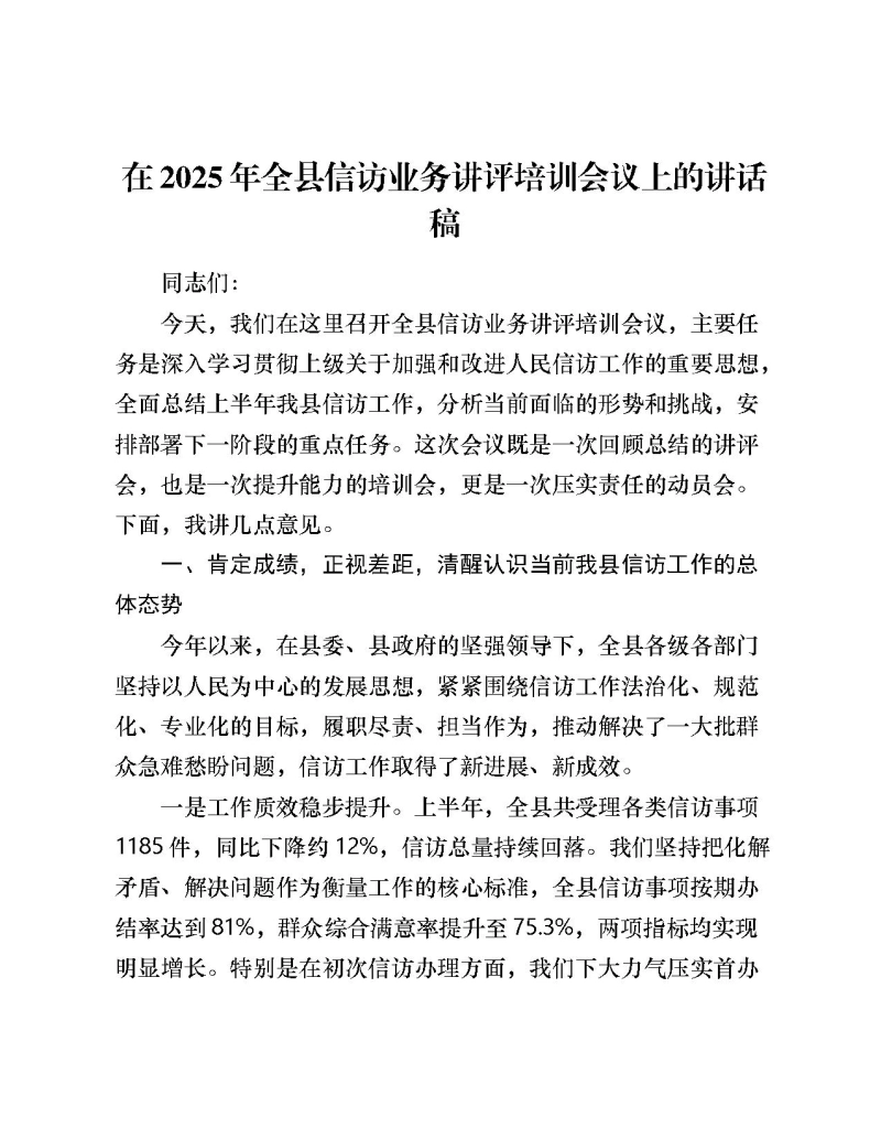 在2025年全县信访业务讲评培训会议上的讲话稿同志们:今天,我们在这里召开全县信访业务讲评培训会议,主要任务是深入学习贯彻上级关于加强和改进人民信访工作的重要思想,全面总结上半年我县信访工作,分析当前面临的形势和挑战,安排部署下一阶段的重点任务。这次会议既是一次回顾总结的讲评会,也是一次提升能力的培训会,更是一次压实责任的动员会。下面,我讲几点意见。一、肯定成绩,正视差距,清醒认识当前我县信访工作的总体态势今年以来,在县委、县政府的坚强领导下,全县各级各部门坚持以人民为中心的发展思想,紧紧围绕信访工作法治化、规范化、专业化的目标,履职尽责、担当作为,推动解决了一大批群众急难愁盼问题,信访工作取得了新进展、新成效。一是工作质效稳步提升。上半年,全县共受理各类信访事项1185件,同比下降约12%,信访总量持续回落。我们坚持把化解矛盾、解决问题作为衡量工作的核心标准,全县信访事项按期办结率达到81%,群众综合满意率提升至75.3%,两项指标均实现明显增长。特别是在初次信访办理方面,我们下大力气压实首办责任,初信初访一次性化解率保持在97%以上的高位水平,有效防止了“小问题”拖成“大麻烦”。二是源头治理持续深化。各乡镇(街道)和县直部门普遍加强了矛盾纠纷排查化解力度,主动发现和处置了一批苗头性、倾向性问题。我们着力推广“有事找书记”等基层治理品牌,畅通和规范群众诉求表达渠道,将大量矛盾化解在基层、化解在萌芽状态。针对国家和省市交办的重点信访积案,我们实行清单化管理、挂图作战,二季度以来,积案化解率环比大幅提升了20多个百分点,啃下了一批硬骨头。三是法治化水平不断提高。我们严格依照《信访工作条例》等法规文件开展工作,依法分类处理信访诉求的导向更加鲜明。信访事项的受理、办理、督办、反馈等环节进一步规范,业务流程的闭环管理机制初步形成。通过组织培训、案例指导等方式,全县信访干部的法治意识和业务能力得到了普遍增强,运用法治思维和法治方式解决问题的能力有了新的提升。在肯定成绩的同时,我们必须清醒地看到,对标上级的要求和群众的期待,我县的信访工作仍然存在一些不容忽视的短板和弱项。主要表现在:第一,工作发展不平衡。有的单位对信访工作的重要性认识不足、投入精力不够,存在“重发展、轻稳定”的倾向,工作时紧时松,导致该单位或领域的信访问题易发多发。第二,源头预防不扎实。从信访问题的领域分布看,城乡建设、征地拆迁、劳动社保、农村农业等领域的矛盾依然比较集中,这深刻反映出一些单位在政策执行、项目推进过程中,群众工作做得不深不细,前端预防和化解机制未能有效发挥作用。第三,办理质效不够高。部分信访事项虽然程序上已经办结,但“案结事了、群众满意”的目标并未真正实现,导致重复访、越级访时有发生。一些干部在处理问题时方法简单、作风生硬,未能做到情理法相统一,影响了办理效果。第四,队伍建设有待加强。面对新形势新任务,少数信访干部的专业素养和综合能力还跟不上,不善于做群众工作,不熟悉相关法律政策,处理复杂矛盾时“手中有招”的能力不足。对于这些问题,我们必须高度重视,采取有力措施,切实加以解决。二、聚焦关键,精准发力,全力推动我县信访工作再上新台阶做好新时代的信访工作,责任重大,使命光荣。全县各级各部门要切实把思想和行动统一到中央和省市的决策部署上来,以更高的标准、更实的举措、更优的作风,抓好各项工作落实。这里,我再强调五点要求:第一,要“心中有责”抓信访,在敢于担当中履职尽责。发展是第一要务,稳定是第一责任。信访工作是衡量一个地区、一个部门社会治理能力和干部担当精神的“经验交流”。各级领导干部特别是“一把手”,必须深刻认识到,抓信访就是抓稳定,抓稳定就是抓发展。要坚决扛起信访工作的政治责任,将其作为“一把手”工程来抓,定期听取汇报、分析形势、研究对策,对重大疑难信访事项要亲自包案、亲自协调、一抓到底。要牢固树立“守土有责、守土负责、守土尽责”的意识,决不能上推下卸、层层批转,真正把责任链条拧紧压实,形成一级抓一级、层层抓落实的强大合力。第二,要“心中有民”抓信访,在为民解难中践行初心。信访工作本质上是群众工作,是送上门来的群众工作。群众信访,反映的是诉求,体现的是信任。我们必须把来访群众当家人,把群众来信当家书,把群众反映的问题当家事,带着深厚的感情去做工作。要严格落实信访工作“三到位一处理”的要求。所谓“诉求合理的解决问题到位”,就是对群众的合法合理诉求,要穷尽一切办法,依法依规及时解决,给群众一个满意的交代,做到案结事了;所谓“诉求无理的思想教育到位”,就是对那些诉求缺乏事实和法律依据的,不能简单回绝,而要耐心细致地做好政策宣传、法律解释和情绪疏导工作,引导他们理性看待问题,依法表达诉求;所谓“生活困难的帮扶救助到位”,就是对那些虽然诉求不合理,但确实生活存在实际困难的群众,要主动衔接民政、社保等部门,开展多元化的帮扶救助,让他们感受到党和政府的温暖。而“行为违法的依法处理”,则是法治社会的必然要求,对于那些罔顾法律、以访谋私、缠访闹访的违法行