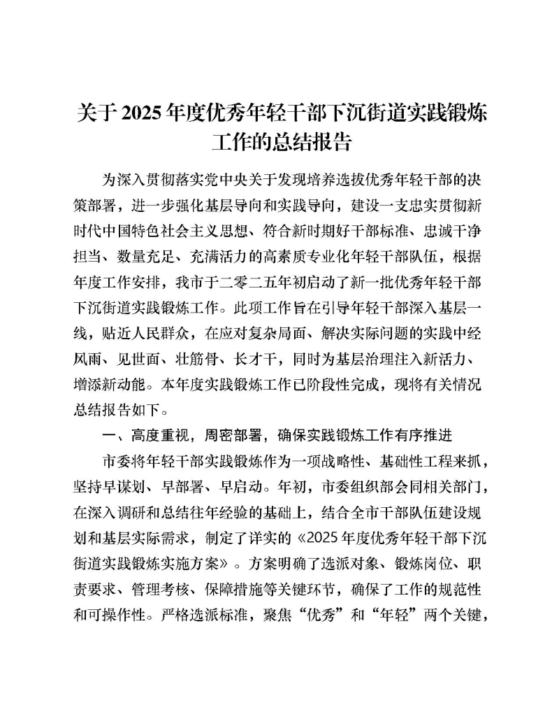 关于2025年度优秀年轻干部下沉街道实践锻炼工作的总结报告为深入贯彻落实党中央关于发现培养选拔优秀年轻干部的决策部署,进一步强化基层导向和实践导向,建设一支忠实贯彻新时代中国特色社会主义思想、符合新时期好干部标准、忠诚干净担当、数量充足、充满活力的高素质专业化年轻干部队伍,根据年度工作安排,我市于二零二五年初启动了新一批优秀年轻干部下沉街道实践锻炼工作。此项工作旨在引导年轻干部深入基层一线,贴近人民群众,在应对复杂局面、解决实际问题的实践中经风雨、见世面、壮筋骨、长才干,同时为基层治理注入新活力、增添新动能。本年度实践锻炼工作已阶段性完成,现将有关情况总结报告如下。一、高度重视,周密部署,确保实践锻炼工作有序推进市委将年轻干部实践锻炼作为一项战略性、基础性工程来抓,坚持早谋划、早部署、早启动。年初,市委组织部会同相关部门,在深入调研和总结往年经验的基础上,结合全市干部队伍建设规划和基层实际需求,制定了详实的《2025年度优秀年轻干部下沉街道实践锻炼实施方案》。方案明确了选派对象、锻炼岗位、职责要求、管理考核、保障措施等关键环节,确保了工作的规范性和可操作性。严格选派标准,聚焦“优秀”和“年轻”两个关键,经过组织推荐、资格审查、比选择优等程序,从市直机关、企事业单位精确筛选了*名政治素质好、发展潜力大、有培养前途但缺乏基层工作经验的年轻干部,其中“85后”处级干部*名,“90后”科级干部*名,专业背景覆盖经济管理、城乡建设、社会治理、法律法规、信息技术等多个领域,为基层带来了多元化的思维和专业知识。召开动员部署会,统一思想,明确任务,严明纪律,激发了下派干部投身基层、干事创业的热情和决心。接收街道也提前做好了岗位安排、带教老师配备和工作生活保障等准备,形成了上下联动、协同推进的良好工作格局。二、聚焦基层,真抓实干,实践锻炼取得显著成效本次下沉实践锻炼为期*个月,下派干部全身心投入街道社区工作,拜群众为师,以实践为课堂,在服务群众的最前沿砥砺初心使命,在化解矛盾的第一线提升能力本领,取得了丰硕的成果。一是强化了政治担当和为民情怀。年轻干部通过深入社区网格、走进居民家中,亲身参与民生服务、政策宣讲、民意收集等工作,直观感受到了基层群众的所思所想所盼,深刻体会到了“江山就是人民,人民就是江山”的丰富内涵。在参与老旧小区改造、帮扶困难群体、组织社区文化活动等具体事务中,他们与群众建立了深厚感情,学会了用群众的语言沟通交流,站在群众的立场思考问题,全心全意为人民服务的宗旨意识进一步筑牢。多位干部在心得体会中写道:“脚下沾满多少泥土,心中就沉淀多少真情。这次锻炼让我真正读懂了‘基层’这本无字之书,理解了‘人民’二字的千钧分量。”二是提升了解决实际问题和应对复杂局面的能力。街道是城市治理体系的基础单元,事务繁杂,矛盾集中。下派干部被安排到信访接待、城市管理、应急处理、项目建设等关键岗位,直接面对征地拆迁、物业纠纷、环境整治、疫情防控等棘手问题。他们不再只是政策的“翻译官”,更成为了执行的“操盘手”。在带教老师的指导下,他们学习运用法治思维和群众工作方法,成功参与调解了*起邻里纠纷;牵头或参与了*项微更新、微治理项目,有效改善了社区环境;在应对突发自然灾害和公共安全事件中,冲锋在前,展现了良好的应急处突能力和责任担当。通过“啃硬骨头”、“接烫手山芋”,他们的调查研究能力、科学决策能力、改革攻坚能力、群众工作能力和抓落实能力得到了全方位的锻炼和显著提升。三是改进了工作作风和机关形象。基层工作直接面向群众,来不得半点虚功。下派干部褪去“机关气”,染上“泥土香”,摒弃“骄娇二气”,发扬“严实深细”的作风。他们与街道社区干部同工同勤,加班加点成为常态,跑遍辖区角落成为习惯。这种务实、肯干、接地气的作风,不仅赢得了基层干部群众的广泛好评,也潜移默化地影响了派出单位的工作风气。他们成为了连接上级机关和基层一线的“桥梁”和“纽带”,将基层的鲜活经验和真实声音带回了机关,促进了机关决策更贴近实际、更符合民意,同时也将机关的规范流程和高效方法引入基层,助力提升了基层工作的规范化水平。四是贡献了专业才智和青春活力。下派干部充分发挥自身的专业特长和资源优势,为街道社区带来了新理念、新方法、新资源。有的利用法律专业知识,为街道提供了法律咨询,参与了合同审核,提升了依法行政水平;有的运用经济学背景,协助街道分析区域经济特点,参与招商引资方案的制定;有的精通信息技术,帮助社区优化了网格化管理平台,提升了智慧社区建设水平。他们积极组织参与青年志愿活动、文化沙龙、知识讲座等,为社区注入了蓬勃的朝气与活力,成为了推动基层治理创新的重要力量。三、完善机制,严管厚爱,保障实践锻炼过程扎实有效为确保实践锻炼不走过场、取得实效,我们着力在管理和服务上下功夫。一是健全管理考核机制。实行派出单位和接收街道双重管理,以街道管理为主。市委组织部进行跟踪管理,定期不定期开展走访调研、座谈交流,及时了解干部思想动态和工作表现。建立实绩档