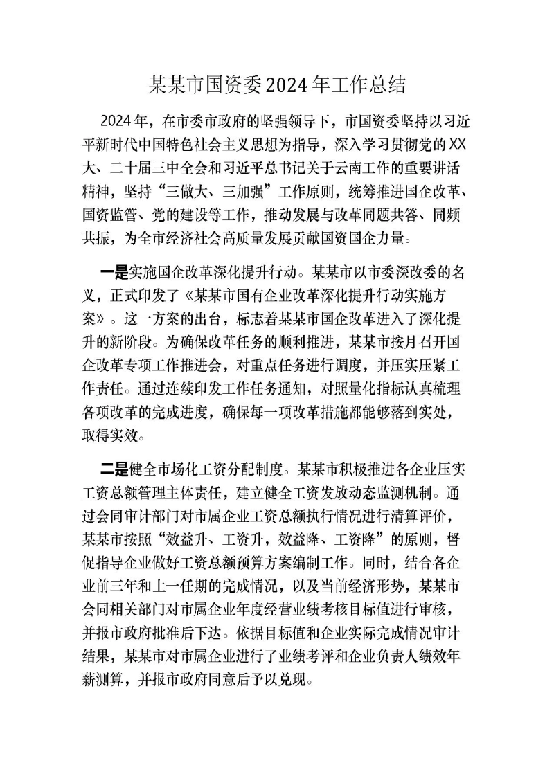 某某市国资委2024年工作总结2024年,在市委市政府的坚强领导下,市国资委坚持以习近平新时代中国特色社会主义思想为指导,深入学习贯彻党的XX大、二十届三中全会和习近平总书记关于云南工作的重要讲话精神,坚持“三做大、三加强”工作原则,统筹推进国企改革、国资监管、党的建设等工作,推动发展与改革同题共答、同频共振,为全市经济社会高质量发展贡献国资国企力量。一是实施国企改革深化提升行动。某某市以市委深改委的名义,正式印发了《某某市国有企业改革深化提升行动实施方案》。这一方案的出台,标志着某某市国企改革进入了深化提升的新阶段。为确保改革任务的顺利推进,某某市按月召开国企改革专项工作推进会,对重点任务进行调度,并压实压紧工作责任。通过连续印发工作任务通知,对照量化指标认真梳理各项改革的完成进度,确保每一项改革措施都能够落到实处,取得实效。二是健全市场化工资分配制度。某某市积极推进各企业压实工资总额管理主体责任,建立健全工资发放动态监测机制。通过会同审计部门对市属企业工资总额执行情况进行清算评价,某某市按照“效益升、工资升,效益降、工资降”的原则,督促指导企业做好工资总额预算方案编制工作。同时,结合各企业前三年和上一任期的完成情况,以及当前经济形势,某某市会同相关部门对市属企业年度经营业绩考核目标值进行审核,并报市政府批准后下达。依据目标值和企业实际完成情况审计结果,某某市对市属企业进行了业绩考评和企业负责人绩效年薪测算,并报市政府同意后予以兑现。三是加大企业“压减”工作力度。通过印发《市属国有企业法人压减工作方案》,某某市着力减员增效,消除冗员,解决部分企业管理幅度过大、子企业数量偏多等问题。围绕主责主业,某某市确定了压减企业名单,并“一企一策”制定压减工作方案。预计到2024年底前,某某市将完成管理层级压减至三级以内,法人层级压减至四级以内的目标,从而打造精简高效的组织管理架构。四是推动产投基金招引。某某市也取得了显著进展。经过市政府常务会议和市委深改委会议的审议通过,《某某市设立产业发展母基金工作方案》得以正式实施。目前,产业发展母基金管理团队已经遴选完成,基金管理公司也已设立,并完成了首期基金的备案工作。随着母基金托管银行的遴选完成和基金户、募集账户、托管账户的开通,某某市正在有序推进母基金在中基协的备案工作。下一步,某某市将签署LP合投文件,积极发挥基金管理机构产业导入职能,全新构建市县(区)多层次基金体系。这将有助于某某市平台公司的市场化转型,为全市的双招双引工作开辟新赛道、开创新模式。五是充分降低融资成本。某某市充分发挥了西湖投资集团、铜都投资集团AA+主体信用等级的优势作用。通过向交易商协会提交发行中期票据申请等方式,某某市进一步降低了融资成本。同时,某某市还积极推进市交投集团争创AA+信用评级,并谋划整合市内有效经营性净资产。所属能投公司也完成了AA信用评级。各平台公司通过转售、置换、谈判等方式着力降低存量债务成本、调整存量债务结构。据统计,市建投公司、市交投集团和市国控集团分别节约了不同额度的融资成本。六是科学编制融资计划。积极响应《关于编报市属国有企业年度财务分析报告暨年度资金需求及融资计划的通知》的要求,指导各平台公司按年度精心制定融资计划。在此过程中,我们加强了对债券全流程的严格管控,坚决禁止新增隐性债务和非标融资行为,以确保融资活动的稳健与合规。同时,我们鼓励企业根据自身实际情况制定融资管理办法,以有效防范债务重大风险。例如,市国控集团对《融资管理暂行办法》进行了修订,并拟定了《债务风险处置工作方案》;市文投公司则印发了《某某市文化产业投资有限责任公司担保管理办法》及《某某市文化产业投资有限责任公司经营性资产出租管理暂行办法》等相关文件,以进一步规范融资与资产管理工作。七是盘活利用国有资产精细化。根据市人大常委会的工作要点,我们与市人大常委会预算工委共同组成调研组,深入开展了企业国有资产(不含金融企业)管理情况的专题调研,并撰写了《关于某某市2023年度企业国有资产管理情况的专项报告》。在实际操作中,各企业积极行动,如市建投公司成功引进亚朵酒店和海螺财务共享中心入驻北斗星城;市国控集团则盘活了意大利风情街x万平方米的场地,吸引了医美中心、咖啡休闲中心、婚纱中心等多种市场主体入驻,不仅新增了投资额超x亿元,还提供了超过x个就业岗位,有力推动了江南文化园和北斗星城商圈的建设,深度打造了现代服务业聚集区。此外,市交投公司充分利用某某科创产业园的平台优势,成功引进x家科创企业签约注册,总投资额高达约x亿元;市文投公司则对“铜官山xx”文创园进行了重新规划,并引进了北京高蕴资本,共同打造某某市人力资源服务产业园和大学生创业园,租赁面积共计x平方米。普农集团也高效盘活了闲置用地,通过拆迁和复垦老管理区,新增了耕地和可交易建
