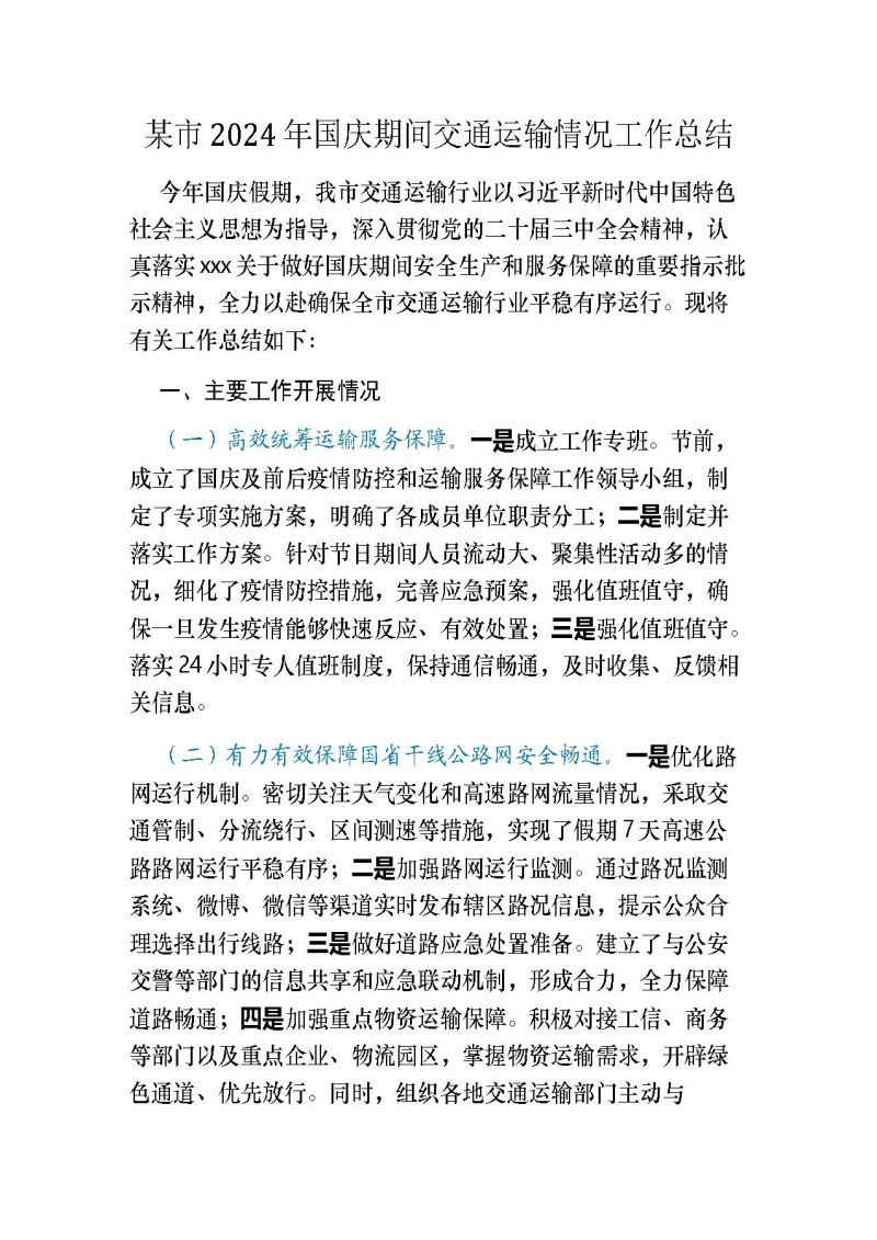 某市2024年国庆期间交通运输情况工作总结今年国庆假期,我市交通运输行业以习近平新时代中国特色社会主义思想为指导,深入贯彻党的二十届三中全会精神,认真落实xxx关于做好国庆期间安全生产和服务保障的重要指示批示精神,全力以赴确保全市交通运输行业平稳有序运行。现将有关工作总结如下:一、主要工作开展情况(一)高效统筹运输服务保障。一是成立工作专班。节前,成立了国庆及前后疫情防控和运输服务保障工作领导小组,制定了专项实施方案,明确了各成员单位职责分工;二是制定并落实工作方案。针对节日期间人员流动大、聚集性活动多的情况,细化了疫情防控措施,完善应急预案,强化值班值守,确保一旦发生疫情能够快速反应、有效处置;三是强化值班值守。落实24小时专人值班制度,保持通信畅通,及时收集、反馈相关信息。(二)有力有效保障国省干线公路网安全畅通。一是优化路网运行机制。密切关注天气变化和高速路网流量情况,采取交通管制、分流绕行、区间测速等措施,实现了假期7天高速公路路网运行平稳有序;二是加强路网运行监测。通过路况监测系统、微博、微信等渠道实时发布辖区路况信息,提示公众合理选择出行线路;三是做好道路应急处置准备。建立了与公安交警等部门的信息共享和应急联动机制,形成合力,全力保障道路畅通;四是加强重点物资运输保障。积极对接工信、商务等部门以及重点企业、物流园区,掌握物资运输需求,开辟绿色通道、优先放行。同时,组织各地交通运输部门主动与S211、S305等干线公路施工项目部、“公转铁”项目施工单位进行对接,及时了解项目建设进展情况和运输需求,为项目建设提供交通运输支撑。(三)提升交通运输综合服务能力。一是强化旅游服务保障。印发《关于做好2024年国庆假期文化和旅游假日工作的通知》,召开了安源区、湘东区、莲花县旅游部门及旅行社座谈会,商讨假日旅游工作安排;二是推进客运转型发展。加大公交车型优化调整力度,新增纯电动公交车10台,更换纯电动车9台;三是优化城市交通出行。在市区重要路口、重点路段设置志愿者疏导点,引导市民群众文明出行;四是改善农村交通基础设施。新改建农村公路危桥8座,提升农村道路安保工程100公里/百平方公里;五是实施农村公路养护工程100公里。(四)着力营造交通运输安全稳定环境。一是强化重点领域安全监管。突出“两客一危”、农村公路、港航和工程建设等重点领域,深入开展安全生产专项整治三年行动集中攻坚;二是强化交通运输执法监督。加强对重点营运车辆动态监控平台的运行监管和非法营运整治力度;与公安交警联合开展治超专项行动。1日至7日,全市共出动执法人员612人次,检查车辆2615辆次,查获超限超载车辆83辆,卸载货物6.55吨;三是开展安全生产督导检查。市交通运输局领导班子带队到各县区、乡镇对交通运输企业安全生产运营情况进行督导检查,督促企业落实主体责任。二、当前交通运输安全生产形势分析从国庆假期7天交通运输安全生产情况来看,我市未发生有影响的交通事故,交通运输行业平稳有序运行。但我们也清醒认识到存在的问题和不足:(一)安全生产责任压得不实不严。部分单位存在重生产轻安全现象,安全生产投入不足、安全管理薄弱等问题依然存在;(二)基础设施建设存在短板弱项。城乡交通运输基础设施建设发展不平衡的问题依然存在;(三)事中事后监管还不够有力。上下游衔接不畅、信息化水平较低等问题仍然存在。产生上述问题的原因主要有以下两个方面:一是思想认识不到位。有的单位认为现在经济社会发展相对稳定了,因此在抓安全生产工作时存在麻痹思想、侥幸心理和松劲心态;二是风险隐患排查整治不彻底。个别单位对安全生产重视不够,走过场、敷衍应付的现象依然存在,隐患整改的质量和效果均不理想。三、下一步工作措施建议围绕“保安全、保稳定、促发展”三个任务抓好落实:(一)提高政治站位,贯彻落实重要精神。一是深化思想认识。进一步认清交通运输安全生产面临的严峻形势和做好安全生产工作的极端重要性;二是狠抓责任落实。把责任落实到每一个人身上每一个岗位上,建立健全安全生产责任体系并层层压实压死;三是用好“四种形态”。对安全隐患整改不力或拒不整改的严肃追责问责,让失责必问成为常态。(二)针对问题不足,抓好整改提升。一是提升基础设施建设水平。加快构建互联互通的综合交通网络体系,不断完善城乡公共交通基础设施网络;二是提升交通运输安全管理水平。大力推进道路运输企业安全生产标准化建设,推广应用安全营运智能监控系统;三是提升综合交通运输管理水平。加快推进出行服务枢纽建设、“公转铁”“公转水”等重大项目实施进度;四是提升执法监管能力水平。深化综合行政执法改革,构建权责一致的大交通管理格局。(三)坚守岗位职责,全力打赢保畅攻坚战。优化和改进交通保畅预案,评估其科学性和实用性,特别是恶劣天气下的应急预案。增强交通保畅能力,包括增加救援力量和设