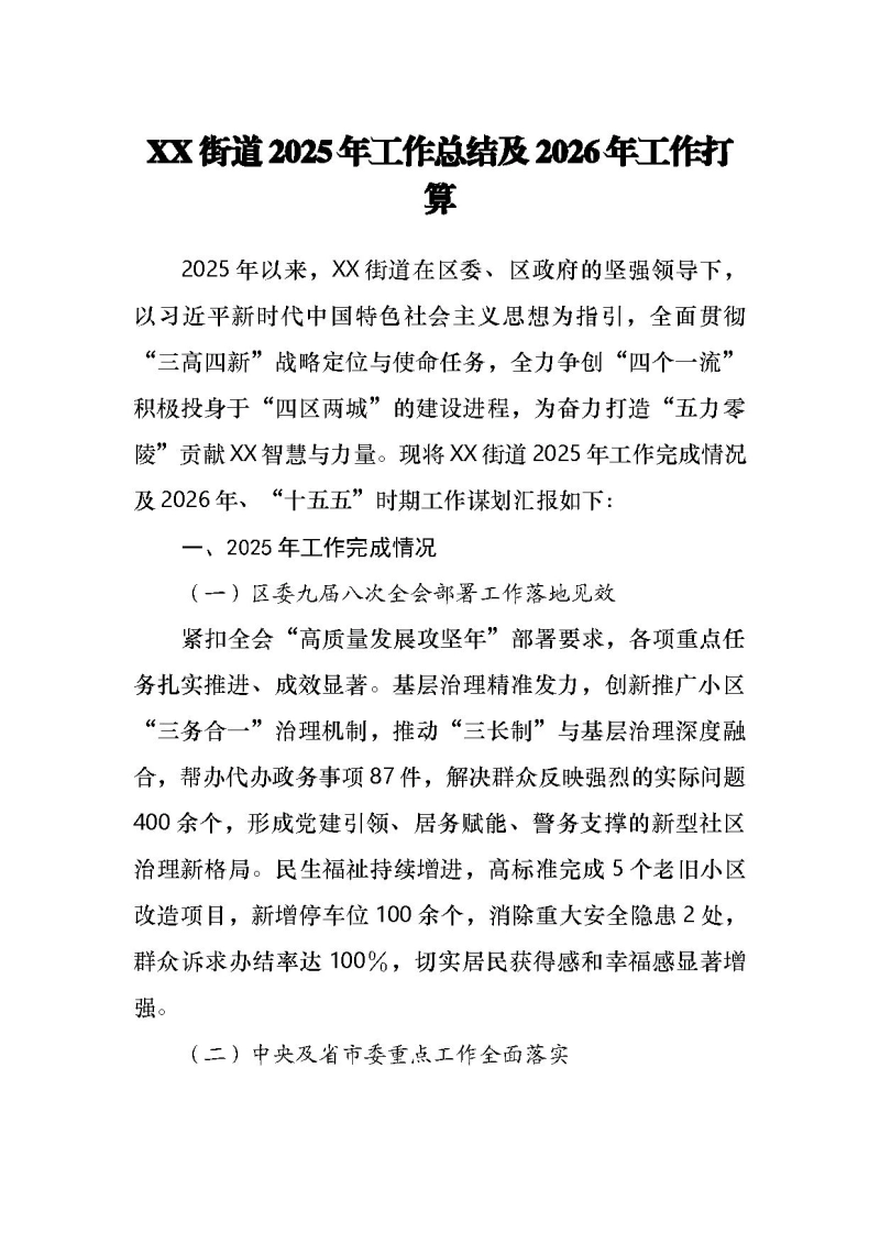 XX街道2025年工作总结及2026年工作打算2025年以来,XX街道在区委、区政府的坚强领导下,以习近平新时代中国特色社会主义思想为指引,全面贯彻“三高四新”战略定位与使命任务,全力争创“四个一流”,积极投身于“四区两城”的建设进程,为奋力打造“五力零陵”贡献XX智慧与力量。现将XX街道2025年工作完成情况及2026年、“十五五”时期工作谋划汇报如下:一、2025年工作完成情况(一)区委九届八次全会部署工作落地见效紧扣全会“高质量发展攻坚年”部署要求,各项重点任务扎实推进、成效显著。基层治理精准发力,创新推广小区“三务合一”治理机制,推动“三长制”与基层治理深度融合,帮办代办政务事项87件,解决群众反映强烈的实际问题400余个,形成党建引领、居务赋能、警务支撑的新型社区治理新格局。民生福祉持续增进,高标准完成5个老旧小区改造项目,新增停车位100余个,消除重大安全隐患2处,群众诉求办结率达100%,切实居民获得感和幸福感显著增强。(二)中央及省市委重点工作全面落实党建引领持续深化。思想教育方面,坚持“第一议题”学习制度,抓实领导班子政治学习,组织召开党工委理论学习中心组学习12次,深化主题教育成果,解决基层党建薄弱环节问题1个。支部建设方面,推动各支部“三会一课”,开好民主生活会、组织生活会和民主评议党员大会。严把党员入口关,吸收入党积极分子7名、发展党员6名、预备党员转正5名。党员先锋模范方面,注重在新兴领域中选拔优秀党员,大力宣传新兴领域优秀党员的先进事迹,发挥党员先锋模范作用,让党员成为新兴领域发展的一面旗帜。安全态势稳控有序。应急方面,全年组织消防、地质灾害等应急演练10次;针对烧烤店、餐饮店等重点场所开展燃气安全排查整治,覆盖60家经营单位,整改隐患40个;开展消防、住建、防汛、易燃易爆化学品等专项检查50次,消除安全隐患20起,汛期安全转移群众2户12人次。道路交通方面,深化“盔带风暴”行动,联合交警部门纠正交通不文明行为200起,查处非法违法行为100起;开展“畅通生命通道”专项整治22次,清理占用消防通道行为58次。食品安全方面,压紧压实食品安全包保责任,班子成员包保幼儿园、学校7所,累计巡查、检查80余次,移交严重问题线索1例,聚焦野生蘑菇中毒防控关键节点,专项发放各类宣传资料8000份;防溺水方面,严格落实防溺水“四个一”工作要求,在辖区3处重点水域配置值班小屋并安排专职人员全力开展溺水防控工作。平安建设稳步推进。禁毒方面,开展禁毒专题宣传活动5次,217名在册吸毒人员全部管控到位,社区戒毒、社区康复执行率达100%。安置帮教方面,严格遵循“八有”原则,实现全流程精准管控,无脱管漏控现象,重新犯罪率保持为零。反电诈方面,通过坚持每月常态化走访与精准宣教并行,筑牢防控防线,街道电诈发案率显著下降,全年核减涉诈重点管控人员2人,在负面清单退出工作中位居前列。信访方面,构建“周排查+季度大排查”机制,推行每日领导带班接访制度,全年高效处置信访案件52余件,全年重点管控对象无赴省进京非访挂号记录。“利剑护蕾”专项行动方面,多渠道宣传实现全覆盖,走访重点人群家庭160家,联合派出所、司法所对69个酒店、宾馆、出租屋等重点场所开展136次常态化及突击治安检查,督促51家单位完成整改。(三)工作亮点凸显,获上级广泛认可治理创新获省级推介。“三务合一”机制有力推动矛盾纠纷在一线化解,稳步实现无矛盾上交、无越级信访、无民转刑案件、无安全事故“四无目标”,经验做法获评湖南省坚持和发展新时代“枫桥经验”先进典型,在湖南省第四届“基层应急管理与治理创新”高峰论坛会上向全省推广。(四)存在的短板与不足对照高质量发展要求,仍存在三方面差距:一是治理融合深度不足,“三务合一”与“三长制”机制协同效应未充分释放,“1+1>2”的融合效果在部分老旧小区不明显;二是安全防控能力待提升,“三管三必须”责任传导不够到位,数字化、智能化安全管理手段在老旧片区应用不足;三是发展动能支撑薄弱,作为中心城区核心街道,商圈升级、产业培育思路不宽,新质生产力培育举措不够实,工作推进中存在“上热下冷”现象。二、2026年及“十五五”时期工作谋划(一)忠诚履职把稳政治方向。持续抓实领导班子政治理论学习,系统谋划实施补短强弱提升工程,以学铸魂、以学促干、知行合一,不断增强“政治能力”,以实打实的行动忠诚捍卫“两个确立”、坚决做到“两个维护”。(二)践行宗旨办好民生实事。牢固树立以人民为中心的发展思想,深耕“四下基层”优良作风,深化“走找想促”活动实效,带着问题沉到群众中、扎在基层里,聚焦群众普遍关注、反映强烈的痛点难点,精准破解急难愁盼,持续提升群众获得感、幸福感、安全感。(三)聚焦重点提速高质量发展。锚定党的二十届四中全会部署要求,以全面深化改革推进中国式现