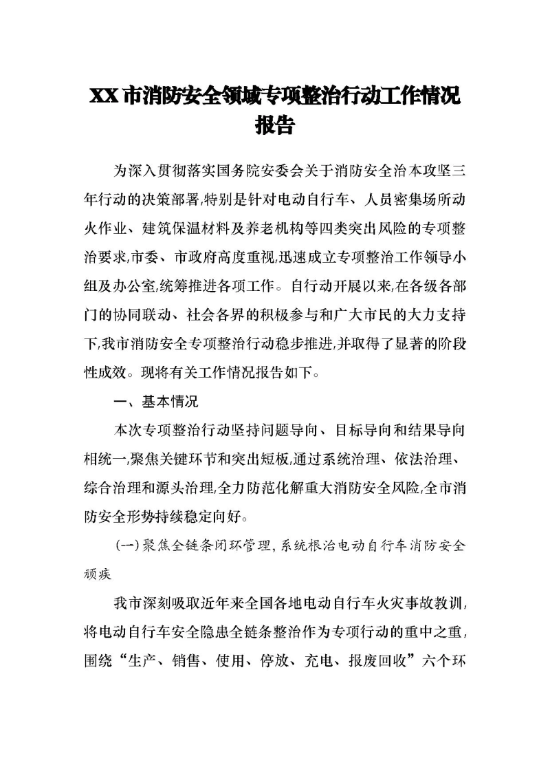 XX市消防安全领域专项整治行动工作情况报告为深入贯彻落实国务院安委会关于消防安全治本攻坚三年行动的决策部署,特别是针对电动自行车、人员密集场所动火作业、建筑保温材料及养老机构等四类突出风险的专项整治要求,市委、市政府高度重视,迅速成立专项整治工作领导小组及办公室,统筹推进各项工作。自行动开展以来,在各级各部门的协同联动、社会各界的积极参与和广大市民的大力支持下,我市消防安全专项整治行动稳步推进,并取得了显著的阶段性成效。现将有关工作情况报告如下。一、基本情况本次专项整治行动坚持问题导向、目标导向和结果导向相统一,聚焦关键环节和突出短板,通过系统治理、依法治理、综合治理和源头治理,全力防范化解重大消防安全风险,全市消防安全形势持续稳定向好。(一)聚焦全链条闭环管理,系统根治电动自行车消防安全顽疾我市深刻吸取近年来全国各地电动自行车火灾事故教训,将电动自行车安全隐患全链条整治作为专项行动的重中之重,围绕“生产、销售、使用、停放、充电、报废回收”六个环节,制定了包含22项重点任务的整治方案,力求实现全过程、全要素的闭环管理。在源头管控方面,联合市场监管、公安、工信等部门,对全市4家整车生产企业和1266家销售单位开展了多轮次执法检查,严厉打击非法改装、销售假冒伪劣电池等违法行为。专项整治期间,共立案查办电动自行车相关违法案件10起,约谈提醒相关单位91家,依法没收不合格产品6件,并公开曝光了1起典型案例,形成了有力震慑。在末端治理方面,针对“充电难、停放乱”的核心问题,我市大力推进充电基础设施建设。截至目前,全市电动自行车保有量约为379.3万辆,为满足巨大的充电需求,我市将充电设施配建纳入民生实事工程,强力推动居民小区充电设施建设。目前,全市已有716个住宅小区按照车辆与充电端口不低于3:1的配建比例,基本完成了充电设施的增建和改建工作。据统计,全市累计建成的集中充电设施接口已超过95万个保有量与充电接口的比例得到显著优化,有效缓解了充电焦虑。通过物理隔离、智能化充电等技术手段,电动自行车“飞线充电”、“进楼入户”等高风险行为得到明显改善。为化解存量风险,我市创新推出了“健康评估+以旧换新+严格执法”三重治理模式。依托社会化服务机构设立了8个电池健康免费评估网点,为市民提供专业的电池安全检测服务。同时,积极引导15家品牌企业参与“以旧换新”活动,通过提供优惠补贴,鼓励市民淘汰老旧及非标车辆。此举不仅提升了车辆的本质安全,也促进了行业的健康发展。得益于一系列综合措施,今年以来,全市未发生因电动自行车引发的火灾事故,与去年同期相比,相关火灾风险实现了根本性遏制。(二)紧盯关键作业环节,坚决筑牢人员密集场所动火安全防线针对人员密集场所动火作业风险高、监管难度大的特点,我市坚持“预防为主、过程严管”的原则,着力健全动火作业全流程安全管理机制。 一是完善制度规范。推动修订并印发了《关于在人员密集场所加强动火作业安全管理的通告》,明确了作业审批、现场监护、应急准备等各方安全责任。同时,针对以往监管盲区,创新推动落实限额以下小型工程动火作业的备案管理制度,将所有动火作业纳入监管视野,确保“凡动火、必报备、必审批、必监护”。二是强化源头追溯。组织对全市范围内的焊接与热切割作业人员培训和考试网点进行全面摸排,严把特种作业人员的准入关。在此基础上,大力推动焊机等动火作业设备“加芯赋码”工作,为每一台设备赋予唯一的身份识别码,实现了从设备、人员到作业现场的全程可追溯,为精准执法和事故倒查提供了技术支撑。三是深化宣传教育。为提升从业人员和社会公众的安全意识,我市创新制作了“莫让焊花成火患、严守规程筑平安”系列警示教育片。通过模拟违规动火作业引发火灾的对照实验,直观展示了违规操作的巨大风险,取得了良好的警示效果。该系列视频通过各类媒体平台广泛传播,触达人群超过百万人次。四是发动社会监督。建立健全了动火作业违法行为投诉举报奖励机制,并通过媒体向社会公布举报电话和渠道,鼓励群众参与监督。专项行动开展以来,动火作业的事前审批率和现场监护到位率显著提升,社会共治的格局初步形成,管理质效得到明显增强。(三)强化源头与存量并重,合力破解建筑保温材料安全难题我市清醒认识到既有建筑外墙保温材料存量风险大、整改难度高的现实,按照“谁所有、谁负责”和“谁主管、谁负责”的原则,对存量和增量风险实施并联治理。在存量隐患排查整治方面,组织住建、消防、城管等部门,对全市范围内的冷库和设有外墙外保温系统的高层民用建筑开展了地毯式专项排查,全面摸清底数。重点针对建筑主体不清、建筑老化严重、特别是使用年限超过15年且采用易燃可燃保温材料的突出隐患建筑,逐一登记造册,建立了详细的风险隐患数据库。在此基础上,推动属地政府和相关行业主管部门分类分级制定整改方案,实行清单化管理、项目化推进,有序推