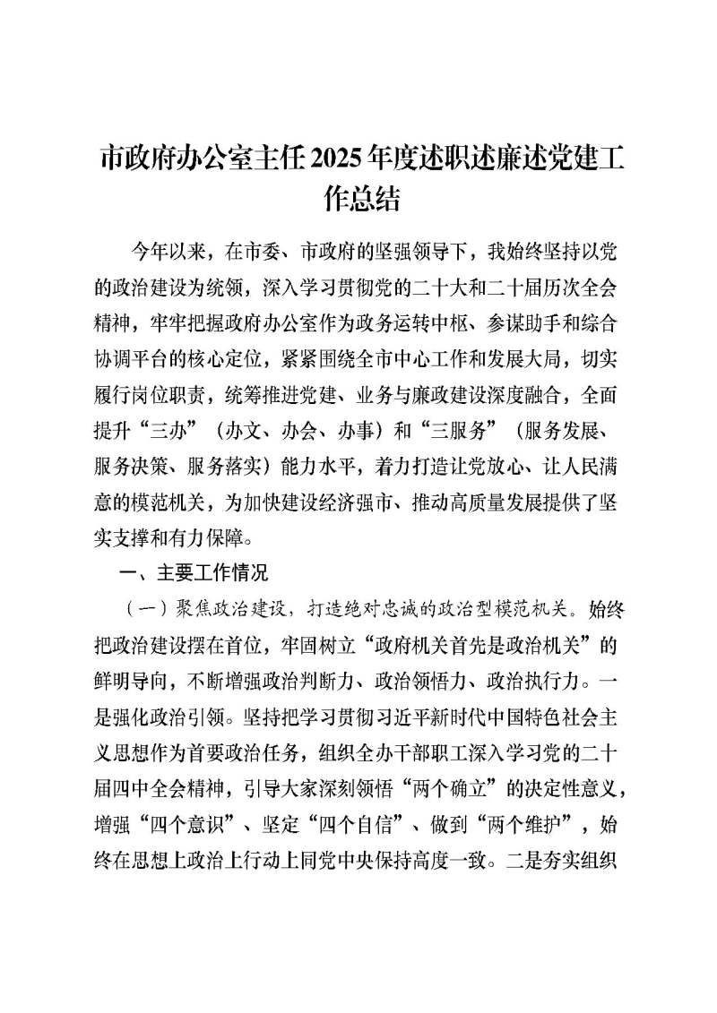 市政府办公室主任2025年度述职述廉述党建工作总结 今年以来,在市委、市政府的坚强领导下,我始终坚持以党的政治建设为统领,深入学习贯彻党的二十大和二十届历次全会精神,牢牢把握政府办公室作为政务运转中枢、参谋助手和综合协调平台的核心定位,紧紧围绕全市中心工作和发展大局,切实履行岗位职责,统筹推进党建、业务与廉政建设深度融合,全面提升“三办”(办文、办会、办事)和“三服务”(服务发展、服务决策、服务落实)能力水平,着力打造让党放心、让人民满意的模范机关,为加快建设经济强市、推动高质量发展提供了坚实支撑和有力保障。一、主要工作情况(一)聚焦政治建设,打造绝对忠诚的政治型模范机关。始终把政治建设摆在首位,牢固树立“政府机关首先是政治机关”的鲜明导向,不断增强政治判断力、政治领悟力、政治执行力。一是强化政治引领。坚持把学习贯彻习近平新时代中国特色社会主义思想作为首要政治任务,组织全办干部职工深入学习党的二十届四中全会精神,引导大家深刻领悟“两个确立”的决定性意义,增强“四个意识”、坚定“四个自信”、做到“两个维护”,始终在思想上政治上行动上同党中央保持高度一致。二是夯实组织基础。高质量完成机关党委及所属党支部换届选举工作,配齐配强党务工作力量;严格落实“三会一课”、组织生活会、民主评议党员、谈心谈话、重大事项请示报告等制度,全年召开支委会36次、党员大会12次、主题党日活动12场,确保党内政治生活规范有序、常态长效。三是深化创建活动。深入开展“五好模范党支部”创建(支部班子好、党员队伍好、工作机制好、工作业绩好、群众反映好),推动党建责任层层压实、组织功能持续增强。四是突出示范带动。带头以普通党员身份参加所在党支部组织生活,严格落实双重组织生活制度,以上率下带动全体党员干部严守政治纪律和政治规矩,营造风清气正、团结奋进的政治生态。(二)聚焦理论武装,打造知行合一的学习型模范机关。坚持把理论学习作为提升干部素养、推动工作创新的基础工程,落实“第一议题”制度,推动学习往深里走、往实里走、往心里走。一是高标准开展学习教育。坚持“学查改”一体推进,扎实开展深入贯彻中央八项规定精神学习教育,制定实施方案,压茬推进读书班、专题研讨、调查研究、检视整改等重点任务。全年举办中心组学习12次、专题读书班4期,班子成员讲授专题党课8人次,形成调研报告15篇,提出对策建议40余条,有效推动学习成果转化为推动发展的实际成效。二是构建多层次学习体系。充分发挥党组理论学习中心组“头雁效应”,带动各科室、各支部同步学、深入学;成立“8090”青年理论学习小组,实施“五学”提质行动(原原本本学、联系实际学、带着问题学、交流互动学、对标先进学),组织开展“提笔能写、开口能讲、问策能对、遇事能办”全能型干部培养计划,全年举办公文写作、政策解读、应急处突等专题培训12场,覆盖干部200余人次。三是丰富学习载体形式。创新开展“品诵红色家书汲取奋进伟力”五四青年诵读沙龙、“追寻红色足迹——中共中央华北局泊头城工部”现场教学、“赏默剧品人生”周末文化沙龙等特色主题党日活动,将理论学习与党性锤炼、人文涵养、团队建设有机融合,有效激发干部职工学习热情和内生动力,推动党的创新理论入脑入心、见行见效。(三)聚焦为民服务,打造人民满意的服务型模范机关。始终坚持人民至上理念,把服务群众、服务基层作为工作的出发点和落脚点,推动政府办公室工作从“事务型”向“服务型”深度转型。一是深化包联帮扶机制。常态化开展文明城市创建包联工作,建立“月走访、季调度、年评估”工作机制,全年深入社区、村居开展调研走访48次,协调解决群众反映强烈的路灯不亮、排水不畅、垃圾清运不及时等“急难愁盼”问题63件。二是办好民生实事项目。聚焦“小切口、大民生”,为包联社区和定点帮扶村定制党建示范公益展牌12块,修缮破损道路1.2公里,安装太阳能路灯80盏,新建便民晾晒区、健身角等公共设施9处,切实提升群众获得感、幸福感、安全感。三是大兴调查研究之风。在全办推行“结对调研”机制,由班子成员带队,围绕产业发展、营商环境、基层治理、乡村振兴等重点领域,深入一线掌握实情、解剖麻雀。全年形成高质量调研成果18篇,其中3篇获市政府主要领导批示肯定,相关建议被纳入市级政策文件,有效发挥了参谋辅政作用。(四)聚焦效能提升,打造高效务实的效能型模范机关。坚持“文经我手无差错、事到我处无遗漏”的工作标准,以制度化、规范化、精细化为抓手,全面提升政务运行质效。一是强化统筹协调。健全完善公文流转、会议组织、督查督办、应急值守等工作流程,全年高质量承办市政府常务会议、专题会议等各类会议86场,审核把关各类文件1200余件,实现零差错、零延误。二是优化工作机制。推动建立“首问负责、限时办结、闭环管理”制度,对重点任务实行台账化管理、清单式推进、销号式落