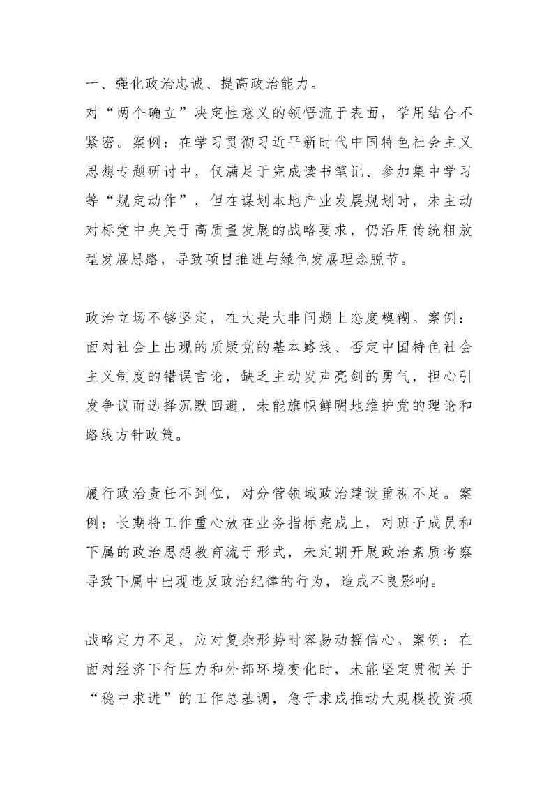 强化政治忠诚、提高政治能力。对“两个确立”决定性意义的领悟流于表面,学用结合不紧密。案例:在学习贯彻习近平新时代中国特色社会主义思想专题研讨中,仅满足于完成读书笔记、参加集中学习等“规定动作”,但在谋划本地产业发展规划时,未主动对标党中央关于高质量发展的战略要求,仍沿用传统粗放型发展思路,导致项目推进与绿色发展理念脱节。政治立场不够坚定,在大是大非问题上态度模糊。案例:面对社会上出现的质疑党的基本路线、否定中国特色社会主义制度的错误言论,缺乏主动发声亮剑的勇气,担心引发争议而选择沉默回避,未能旗帜鲜明地维护党的理论和路线方针政策。履行政治责任不到位,对分管领域政治建设重视不足。案例:长期将工作重心放在业务指标完成上,对班子成员和下属的政治思想教育流于形式,未定期开展政治素质考察,导致下属中出现违反政治纪律的行为,造成不良影响。战略定力不足,应对复杂形势时容易动摇信心。案例:在面对经济下行压力和外部环境变化时,未能坚定贯彻关于“稳中求进”的工作总基调,急于求成推动大规模投资项目,忽视了项目可行性论证,导致部分项目中途停滞,造成公共资源浪费。贯彻落实党中央大政方针存在“温差”“落差”,结合实际创新不足。案例:在推进乡村振兴战略过程中,机械照搬上级政策文件,未结合本地资源禀赋和产业基础制定具体实施方案,简单将资金投入到基础设施建设上,未能有效带动特色产业发展,未能切实提升群众获得感。政治敏锐性不强,对苗头性、倾向性政治问题察觉不及时。案例:在日常工作中,对下属在工作汇报中出现的违背政治原则的表述未及时纠正,对单位内部出现的小圈子、小团伙苗头未高度警惕,未能及时防范化解组织内部的政治风险。政治修养锤炼不持续,未能将讲政治内化为内在主动。案例:认为自己资格老、经验丰富,在政治理论学习上存在懈怠情绪,参加组织生活时经常缺席,对党组织安排的政治历练任务敷衍了事,政治判断力、政治领悟力持续下降。在落实“一岗双责”中,重业务轻政治,管党治党责任虚化。案例:某分管领导在推进项目建设过程中,只关注工程进度和质量,对项目建设中的廉政风险和政治纪律要求强调不足,未建立健全监督制约机制,导致项目管理人员出现权钱交易问题。对“两个确立”决定性意义的理论领悟不深不透,学用脱节。在组织本单位专题学习时,仅满足于传达原文、完成学习次数,未结合工作实际深入研讨其核心要义与实践要求。例如,在学习贯彻高质量发展相关论述时,仅停留在记笔记、写心得的表面层面,未能将“两个确立”的政治引领作用与本地区产业转型升级工作深度融合,导致制定的产业扶持政策缺乏系统性和前瞻性,在应对市场波动时未能有效发挥政策效能,3个重点扶持项目因规划不科学出现进度滞后问题。政治敏锐性不足,对意识形态领域风险防范意识薄弱。面对网络传播的各类信息,缺乏主动甄别和警惕性,未能及时发现潜在的政治风险隐患。例如,某网络平台出现关于本单位重大项目建设的不实传言,涉及资金使用和工程质量等敏感内容,初期未引起足够重视,未及时启动舆情应对机制,导致传言扩散蔓延,引发部分群众误解和质疑,损害了单位公信力,后续花费大量精力开展辟谣工作才逐步平息。落实“两个维护”存在温差落差,执行上级决策部署不够坚决。在推进跨区域生态环境联合整治工作中,因涉及本地部分企业整改成本较高,担心影响地方短期经济指标,出现犹豫观望态度,未严格按照上级要求的时间节点推进整治工作。例如,上级明确要求3个月内完成辖区内12家污染企业的整改关停,但实际推进中因过度考虑企业诉求,协调力度不足,导致4家企业未能按时完成整改,影响了区域生态环境治理整体成效。政治理论学习长效机制不健全,学习系统性和针对性缺失。学习计划制定流于形式,多以集中传达文件、观看教育影片为主,缺乏分层分类的学习设计和实践研讨环节。例如,全年组织的20次政治理论学习中,仅有3次结合业务工作开展专题研讨,其余均为“读文件、划重点”模式,导致干部职工对党的创新理论理解浮于表面,在解决基层群众反映强烈的民生问题时,未能有效运用理论指导实践,5件民生实事办理效率低于预期。政治站位不够高,全局意识不强,存在本位主义倾向。在推进跨部门协作项目时,过度关注本部门工作任务和利益得失,忽视整体工作推进大局。例如,在开展乡村振兴专项帮扶工作中,本单位作为牵头部门,未能主动统筹协调农业、民政、交通等相关部门资源,仅聚焦自身负责的资金拨付工作,对帮扶村基础设施建设、产业发展等关键问题协调不力,导致帮扶项目整体进度延迟2个月,未能按时完成年度帮扶目标。政治执行存在宽松软现象,对党内政治规矩执行不够严格。在党内组织生活中,对一些违反政治规矩的细节问题重视不足,纠正不够及时有力。例如,在支部组织生活会上,部分党员干部习惯以职务称呼彼此,未严格使用同志称谓,对此仅进行口头提醒,未纳入批评教育范畴;部分党员缺席组织生活后