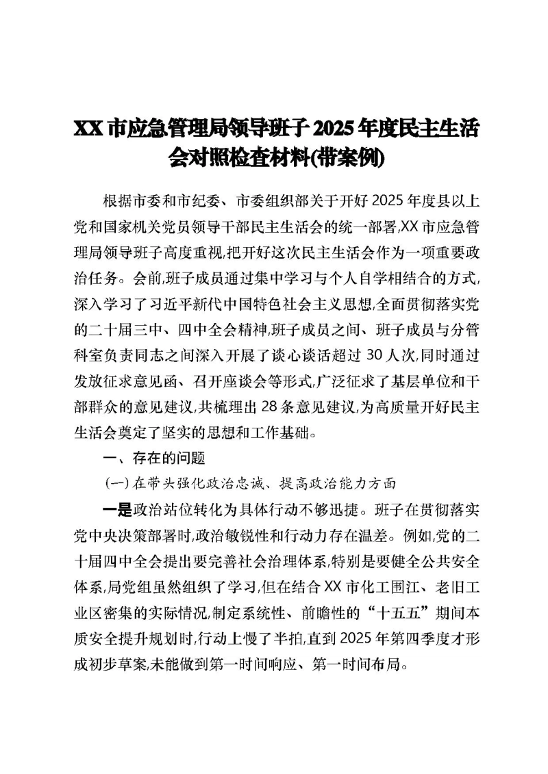 XX市应急管理局领导班子2025年度民主生活会对照检查材料(带案例)根据市委和市纪委、市委组织部关于开好2025年度县以上党和国家机关党员领导干部民主生活会的统一部署,XX市应急管理局领导班子高度重视,把开好这次民主生活会作为一项重要政治任务。会前,班子成员通过集中学习与个人自学相结合的方式,深入学习了习近平新代中国特色社会主义思想,全面贯彻落实党的二十届三中、四中全会精神,班子成员之间、班子成员与分管科室负责同志之间深入开展了谈心谈话超过30人次,同时通过发放征求意见函、召开座谈会等形式,广泛征求了基层单位和干部群众的意见建议,共梳理出28条意见建议,为高质量开好民主生活会奠定了坚实的思想和工作基础。一、存在的问题(一)在带头强化政治忠诚、提高政治能力方面一是政治站位转化为具体行动不够迅捷。班子在贯彻落实党中央决策部署时,政治敏锐性和行动力存在温差。例如,党的二十届四中全会提出要完善社会治理体系,特别是要健全公共安全体系,局党组虽然组织了学习,但在结合XX市化工围江、老旧工业区密集的实际情况,制定系统性、前瞻性的“十五五”期间本质安全提升规划时,行动上慢了半拍,直到2025年第四季度才形成初步草案,未能做到第一时间响应、第一时间布局。二是政治风险的洞察预判不够深刻。在日常工作中,对业务工作背后潜藏的政治风险和社会稳定风险认识不深。在2025年处置一起因企业粉尘管道维护不当引发的燃爆事故中,班子初期的关注点主要集中在事故的技术原因调查和责任追究上,对于事故可能引发的周边居民恐慌情绪、网络舆情发酵以及对全市同类型企业安全生产信心的冲击等社会性、政治性风险,预判不足、应对预案不周,导致后期舆情应对一度陷入被动。三是政治责任的闭环落实不够严实。在推动重大决策部署落地见效上,存在“上游热、中游温、下游冷”的现象。例如,为推进“智慧应急”建设,市局层面投入近300万元升级了应急指挥平台,但在推动平台功能向县(市)区、乡镇(街道)延伸应用时,跟踪问效不紧,导致截至2025年底,全市基层单位平台激活率仅为65%,数据上传的及时性和准确性不高,市级平台的“千里眼、顺风耳”作用未得到充分发挥,政治责任未能形成有效闭环。(二)在带头固本培元、增强党性方面一是理论学习与应急实践融合不够紧密。班子成员在学习习近平总书记关于应急管理重要论述时,往往满足于读原文、记要点,但在如何运用其蕴含的立场、观点、方法破解现实难题上思考不深。2025年组织对全市15个重大危险源企业进行安全评估时,多数讨论仍停留在技术标准和规范层面,未能从总书记强调的“人民至上、生命至上”理念出发,创新性地提出如何从根本上降低区域系统性风险的策略,理论与实践存在“两张皮”现象。二是斗争精神在攻坚克难中淬炼不够充分。面对应急管理领域的“老大难”问题,敢于斗争、善于斗争的锐气有所消减。对于长期存在的“三小”场所消防安全隐患问题,尽管每年都组织专项整治,但往往陷入“检查、整改、回潮”的循环。三是党性修养在日常言行中体现不够自觉。班子成员能够严守党章党规党纪,但在一些非原则性问题上,自我要求有所放松。在内部工作会议的讨论环节,有时会出现“发牢骚”“讲怪话”的现象,虽然没有违反纪律,但从侧面反映出部分同志在面对工作压力时,未能时刻以党员领导干部的标准来约束自己的言行,党性锤炼的全时段、全方位自觉性不强。(三)在带头敬畏人民、敬畏组织、敬畏法纪方面一是深入基层联系群众服务群众不够贴心。落实“四下基层”制度有时存在“走过场”的形式主义倾向。2025年班子成员累计下基层调研70余次,但真正带着问题、沉到一线解剖麻雀式的调研不多。例如,在一次赴XX县调研乡镇应急能力建设时,行程安排紧凑,听取汇报、查看台账占用了大部分时间,与基层应急专干的深入交流不足,未能充分掌握他们“一人多岗、装备老化、专业技能缺乏”的真实困境,导致后续出台的支持政策针对性不强。二是贯彻执行民主集中制原则不够到位。在班子议事决策中,有时存在准备不充分、酝酿不深入的情况,导致民主决策的质量不高。“三重一大”事项虽然都上会研究,但在2025年6月讨论一笔超过50万元的应急救援装备采购项目时,分管领导在会前与其他班子成员的沟通仅限于电话通知,未能提供详细的装备性能对比和市场调研报告,使得会上讨论流于形式,最终的决策主要依赖于分管领导的意见,民主集中制的优势未得到充分发挥。三是依法用权规范用权律己用权不够严格。对权力运行的监督制约还存在薄弱环节,特权思想和特权现象未能从根源上杜绝。在安全生产行政执法中,虽然有明确的自由裁量权基准,但在实际操作中,对一些“关系企业”“重点项目”的处罚,存在“就低不就高”的倾向。2025年全年共作出行政处罚213起,罚款总额580万元,但分析发现,其中有近10%的案件处罚金额踩着法定最低线,未能充分体现法律的威