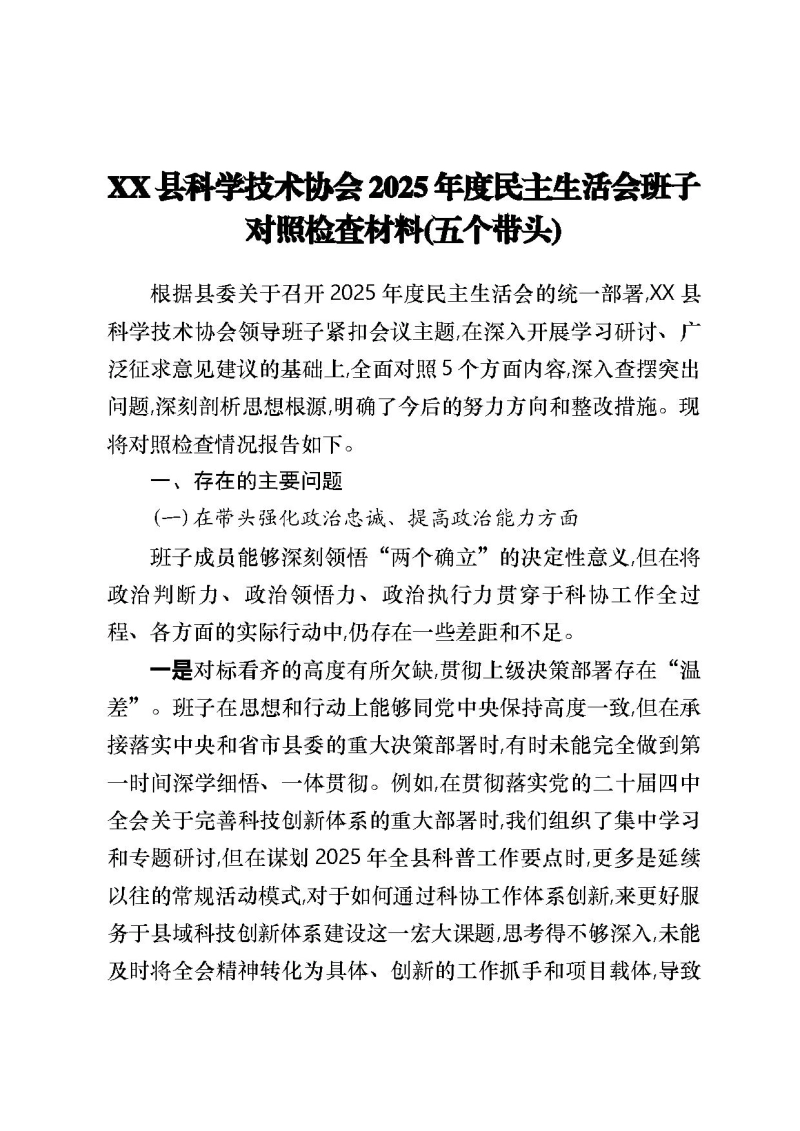 - 2026-01-18 17:07XX县科学技术协会2025年度民主生活会班子对照检查材料(五个带头)