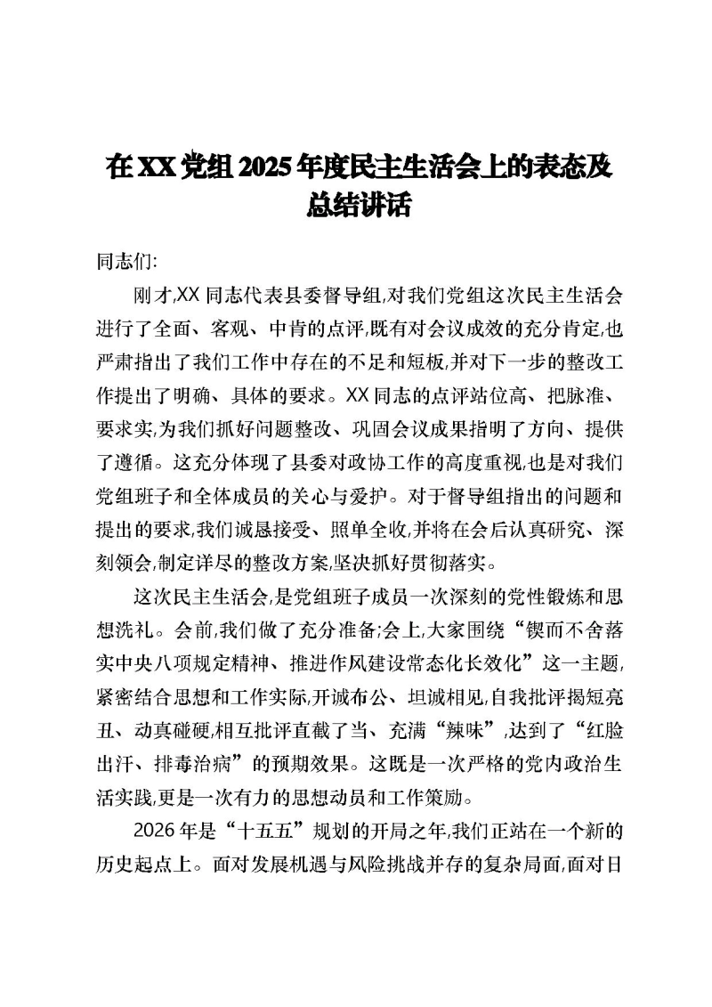 在XX党组2025年度民主生活会上的表态及总结讲话同志们:刚才,XX同志代表县委督导组,对我们党组这次民主生活会进行了全面、客观、中肯的点评,既有对会议成效的充分肯定,也严肃指出了我们工作中存在的不足和短板,并对下一步的整改工作提出了明确、具体的要求。XX同志的点评站位高、把脉准、要求实,为我们抓好问题整改、巩固会议成果指明了方向、提供了遵循。这充分体现了县委对政协工作的高度重视,也是对我们党组班子和全体成员的关心与爱护。对于督导组指出的问题和提出的要求,我们诚恳接受、照单全收,并将在会后认真研究、深刻领会,制定详尽的整改方案,坚决抓好贯彻落实。这次民主生活会,是党组班子成员一次深刻的党性锻炼和思想洗礼。会前,我们做了充分准备;会上,大家围绕“锲而不舍落实中央八项规定精神、推进作风建设常态化长效化”这一主题,紧密结合思想和工作实际,开诚布公、坦诚相见,自我批评揭短亮丑、动真碰硬,相互批评直截了当、充满“辣味”,达到了“红脸出汗、排毒治病”的预期效果。这既是一次严格的党内政治生活实践,更是一次有力的思想动员和工作策励。2026年是“十五五”规划的开局之年,我们正站在一个新的历史起点上。面对发展机遇与风险挑战并存的复杂局面,面对日趋激烈的区域竞争态势,我们必须以此次民主生活会为契机,以刮骨疗毒的勇气和自我革命的精神,扎实做好问题整改的“后半篇文章”,以崭新的精神面貌和过硬的工作作风,奋力推动新时代XX政协事业高质量发展。下面,我代表党组班子,就巩固深化民主生活会成果,讲四点要求。第一,筑牢政治忠诚之基,在理论武装上展现新高度。旗帜鲜明讲政治是人民政协的首要原则。必须始终把坚持和加强党的全面领导作为最高政治原则和根本政治规矩,深刻领悟“两个确立”的决定性意义,以实际行动坚决做到“两个维护”。党组班子成员要带头持续深化对习近平新时代中国特色社会主义思想的学习贯彻,做到学思用贯通、知信行统一。要着力提升理论学习的系统性和转化效能,不能停留在读了多少、记了多少,而要看是否真正入脑入心,是否切实把学习成果转化为谋划工作的科学思路、破解难题的有效举措、推动发展的过硬能力,确保县委的各项决策部署在政协系统不折不扣地得到贯彻执行。第二,抓实问题整改之要,在作风建设上取得新突破。民主生活会的成效,最终要通过问题整改来检验。会后,要立即着手梳理查摆出的问题以及相互批评的意见,建立详尽的整改清单,形成党组班子和班子成员的整改方案。要坚持“当下改”与“长久立”相结合,逐项明确整改目标、责任主体和完成时限,实行销号管理,确保件件有着落、事事有回音。作风建设永远在路上,中央八项规定精神是长期有效的铁规矩、硬杠杠。班子成员要以身作则,带头弘扬党的光荣传统和优良作风,以钉钉子精神推动作风建设常态化长效化,营造风清气正的政治生态。第三,提升履职为民之效,在服务大局中彰显新担当。人民政协为人民。必须始终把履职为民作为政协工作的出发点和落脚点,常念“百家忧”、善解“千户结”,在增进民生福祉上用心用情,把履职答卷书写在民生冷暖之上。要紧紧围绕XX县“十五五”规划的宏伟蓝图和县委的中心工作,精准选择切入点和着力点,深入开展调查研究、政治协商和民主监督。要聚焦经济社会发展的关键领域、社会治理的难点痛点、人民群众急难愁盼的具体问题,多建睿智之言,多献务实之策。同时,要积极协助县委、县政府多做宣传政策、解疑释惑、理顺情绪、化解矛盾的工作,努力在建言资政和凝聚共识上双向发力,实现“春风化雨、润泽万家灯火”的社会效果,为开创XX发展新征程贡献政协智慧和力量。第四,永葆清正廉洁之本,在从严治党中树立新标杆。党组班子作为政协系统的“关键少数”,必须坚决扛起全面从严治党主体责任,以更高标准、更严要求加强自身建设。要始终把党性修养作为终身必修课,严格执行党内政治生活各项制度,带头营造健康的党内同志关系。要发扬斗争精神,增强斗争本领,敢于较真碰硬,对不良风气和错误言行要敢于亮剑、坚决斗争。必须始终把纪律和规矩挺在前面,教育引导班子成员和广大政协干部、全体委员知敬畏、存戒惧、守底线。要鲜明树立重实干、重实绩的用人导向,激励干部委员勇于担当作为,在服务大局的广阔舞台上展现新时代政协委员的风采,推动党建工作与履职实践深度融合、同向发力,为政协事业发展提供坚强政治保证。同志们,一次民主生活会,就是一次政治体检和党性淬炼。让我们以这次会议为新的起点,在XX县委的坚强领导下,团结带领全体政协委员和机关干部,以更加饱满的热情、更加务实的作风,奋力谱写新时代XX政协事业高质量发展的新篇章,为全面建设社会主义现代化新XX作出新的更大贡献!再次感谢督导组的悉心指导!我的讲话完了,谢谢大家。