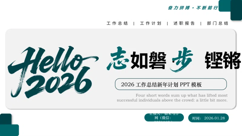 Fourshortwordssumupwhathasliftedmostsuccessfulindividualsabovethecrowd:alittlebitmore.汇报人:如来写作网(微信:3231169)时间:2026.01.28工作总结|工作计划|述职报告|部门总结奋力拼搏·不断前行2026工作总结新年计划PPT模板如磐·铿锵目录CONTENTS年度工作概述Annualworksummary01工作完成情况Jobcompletion02成功项目展示Successfulpresentation03明年工作计划Workplanfornextyear0401年度工作概述请替换文字内容,点击添加相关标题文字,请替换文字内容,点击添加相关标题文字标题文字添加标题文字添加标题文字添加标题文字添加输入标题文字输入标题文字输入标题文字用户可以在投影仪或者计算机上进行演示也可以将演示以将演示文稿打印出来。用户将演示文稿打印出来。用户可以在演示文稿打印出来。用户可以在投影仪或者计算机上进行演示也可以将演示以将演示文稿打印出来。用户将演示文稿打印出来。用户可以在演示文稿打印出来。用户可以在投影仪或者计算机上进行演示也可以将演示以将演示文稿打印出来。用户将演示文稿打印出来。用户可以在演示文稿打印出来。输入标题文字02030104用户可以在投影仪或者计算机上进行演示,也可以将演示文稿打印出来,制作成胶片标题文字添加用户可以在投影仪或者计算机上进行演示,也可以将演示文稿打印出来,制作成胶片标题文字添加用户可以在投影仪或者计算机上进行演示,也可以将演示文稿打印出来,制作成胶片标题文字添加用户可以在投影仪或者计算机上进行演示,也可以将演示文稿打印出来,制作成胶片标题文字添加输入标题文字用户可以在投影仪或者计算机上进行演示也可以将演示文稿打印出来。用户可以在投影仪或者计算机上进行演示也可以将演示用户可以在投影仪或者计算机上进行演示也可以将演示文稿打印出来。用户可以在投影仪或者计算机上进行演示也可以将演示添加主要标题内容输入你的标题输入你的标题输入你的标题输入你的标题输入标题文字用户可以在投影仪或者计算机上进行演示,也可以将演示文稿打印出来,制作成胶片,以便应用到更广泛的领域中。利用MicrosoftOffice用户可以在投影仪或者计算机上进行演示,也可以将演示文稿打印出来,制作成胶片,以便应用到更广泛的领域中。添加标题文字请在此添加文字说明请在此添加文字说明请说明请在此添加文字说明请在此添加文字在此添加文字说明请在此添加文字说明请在此添加文字说明请在此添加文字说明请在此添加文字说明添加标题文字请在此添加文字说明请在此添加文字说明请说明请在此添加文字说明请在此添加文字在此添加文字说明请在此添加文字说明请在此添加文字说明请在此添加文字说明请在此添加文字说明输入标题文字添加标题文字内容用户可以在投影仪或者计算机上进行演示也演示也可以示文稿打印出来。添加标题文字内容用户可以在投影仪或者计算机上进行演示也演示也可以示文稿打印出来。添加标题文字内容用户可以在投影仪或者计算机上进行演示也演示也可以示文稿打印出来。添加标题文字内容用户可以在投影仪或者计算机上进行演示也演示也可以示文稿打印出来。输入标题文字添加标题文字内容用户可以在投影仪或者计算机上计算机上进行演示也演示也可以示文稿打印出来。添加标题文字内容用户可以在投影仪或者计算机上计算机上进行演示也演示也可以示文稿打印出来。添加标题文字内容用户可以在投影仪或者计算机上计算机上进行演示也演示也可以示文稿打印出来。输入标题文字ABCFED用户可以在投影仪或者计算机上进行演示也可以将演示文稿打印出来。用户可以在投影仪或者计算机上进行演示也可以将演示文稿打印出来。用户可以在投影仪或者计算机上进行演示也可以将演示文稿打印出来。用户可以在投影仪或者计算机上进行演示也可以将演示文稿打印出来。用户可以在投影仪或者计算机上进行演示也可以将演示文稿打印出来。用户可以在投影仪或者计算机上进行演示也可以将演示文稿打印出来。输入标题文字02工作完成情况请替换文字内容,点击添加相关标题文字,请替换文字内容,点击添加相关标题文字标题文字添加标题文字添加标题文字添加标题文字添加加入标题70%加入标题92%加入标题87%加入标题52%输入标题文字用户可以在投影仪或者计算机上进行演示计算机上进行演示计算机上进行演示。用户可以在投影仪或者计算机上进行演示计算机上进行演示计算机上进行演示。用户可以在投影仪或者计算机上进行演示计算机上进行演示计算机上进行演示。用户可以在投影仪或者计算机上进行演示计算机上进行演示计算机上进行演示。用户可以在投影仪或者计算机上进行演示计算机上进行演示计算机上进行演示。输入标题文字73%30%50%75%20