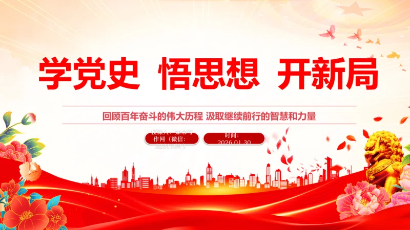 授课人:如来写作网(微信:3231169)时间:2026.01.30学党史悟思想开新局回顾百年奋斗的伟大历程汲取继续前行的智慧和力量第一部分历史的选择——为什么是中国共产党?历史的选择——为什么是中国共产党?在讲述党的具体历程以前,我们首先要回答一个根本问题:为什么说中国共产党的诞生是历史与人民的必然选择?这就必须回到那个“千年未有之大变局”的近代中国。历史的选择——为什么是中国共产党?历史学家黄仁宇先生曾以1587年,也就是明朝万历十五年这一年为切片,洞察中国命运的转折。那个时候,大明王朝表面四海升平,实则内在的活力已近枯竭,制度僵化,思想禁锢。而在地球的另一端,西班牙的无敌舰队正在集结,即将与英格兰争夺海上霸权;而莎士比亚的戏剧即将在伦敦上演;西方正经历文艺复兴、宗教改革的洗礼,近代科学的曙光初现,大航海时代连接了全球。全世界正在发生质变,而古老的东方帝国,却在“天朝上国”的迷梦中逐渐沉睡。1587年历史的选择——为什么是中国共产党?当时东西方两位重要人物同年逝世:中国的是乾隆皇帝与美国的是乔治·华盛顿。乾隆皇帝他自称“十全老人”,留下四万首诗,他将封建专制和文化禁锢推向顶峰,而中国与世界文明的差距,在此刻已被迅猛拉大。此时,牛顿的力学体系已构建完成半个多世纪,而亚当·斯密的《国富论》已出版二十余年,美国的宪法也已施行十余年。一边是迈向现代政治的探索,一边是封建盛世的余晖,历史的轨迹已然分岔。1799年历史的选择——为什么是中国共产党?甲午战争,我们的北洋水师全军覆没,《马关条约》丧权辱国。三十年的洋务运动“自强求富”之梦,在铁甲舰的沉没中破碎。巨额赔款、割让台湾,帝国主义瓜分中国的狂潮骤起。中华民族面临亡国灭种的空前危机。1894年历史的选择——为什么是中国共产党?无数仁人志士前赴后继,进行了可歌可泣的探索。出路在何方?义和团运动,“扶清灭洋”,其爱国热情可嘉,但其盲目排外和封建迷信的色彩,注定无法引领中国走向现代。农民阶级的探索:历史的选择——为什么是中国共产党?维新变法,试图通过君主立宪,自上而下改革。然而,仅仅百天便告夭折,证明在半殖民地半封建的中国,温和的改良道路行不通。资产阶级改良派的探索:历史的选择——为什么是中国共产党?我们的孙中山先生领导辛亥革命,雷霆万钧,一举推翻了两千多年的封建帝制,建立了亚洲第一个共和国,功绩彪炳史册。但是,正如毛泽东同志深刻指出的:“辛亥革命只把一个皇帝赶跑,中国仍旧在帝国主义和封建主义的压迫之下,反帝反封建的革命任务并没有完成。”革命果实很快被袁世凯窃取,随后我们国家就陷入了军阀混战,民不聊生。民族独立、人民解放的历史任务依然悬置,国家富强、人民富裕的目标更是遥不可及。资产阶级革命派的探索:历史的选择——为什么是中国共产党?俄国十月革命一声炮响,给中国送来了马克思列宁主义。1917年五四运动爆发,中国工人阶级开始以独立的姿态登上政治舞台,展现出伟大的力量。马克思主义的理论,遇到了中国工人运动的实践,两者结合,催生了一个全新的领导核心——中国共产党。1919年历史的选择——为什么是中国共产党?7月,在上海石库门、南湖红船,13名代表,代表着全国50多名党员,宣告了中国共产党的成立。这是“开天辟地的大事件”。这个政党,从诞生之初就与以往任何政党、派别、团体有着本质区别:她以最先进的科学理论——马克思主义为指导;她没有任何自身的特殊利益,唯一的目标就是为中国人民谋幸福、为中华民族谋复兴;她拥有最彻底的反帝反封建的革命纲领。1927年第二部分革命的淬炼——从挫折中奋起,闯出新道路革命的淬炼——从挫折中奋起,闯出新道路党成立了,党成立以后呢,那如何在一个半殖民地半封建的落后大国进行革命?这是一道前所未有的难题。我们年轻的党首先选择与当时革命的象征——孙中山领导的国民党合作,共同进行以“打倒列强除军阀”为目标的国民革命。国共合作,创办黄埔军校,推动工农运动,发起北伐战争,势如破竹。但是当时间来到了1927年,当北伐即将取得全国胜利时,蒋介石、汪精卫相继背叛革命,向曾经的盟友共产党人举起了屠刀。“四一二”、“七一五”,上海、广州、长沙……一片白色恐怖。据不完全统计,从1927年3月到1928年上半年,被杀害的共产党员和革命群众多达31万多人,其中共产党员就达到了2.6万多人。党员数量从近6万人锐减到1万多人。血流成河,山河变色。革命的淬炼——从挫折中奋起,闯出新道路敢不敢革命?怎样坚持革命?这是生死存亡的拷问。一些意志不坚定的人脱党、退党,甚至叛变。但是,真正的共产党人没有被吓倒、被征服。他们从血泊中爬起来,擦干身上的血迹,掩埋好同伴的尸首,又继续战斗了。1927年8月1日,南昌城头的枪声,宣告了中国共产党独立领导革命战争、创建人民军队的开始。毛泽东同志在“八七会议”上提出了那句著名论断:“