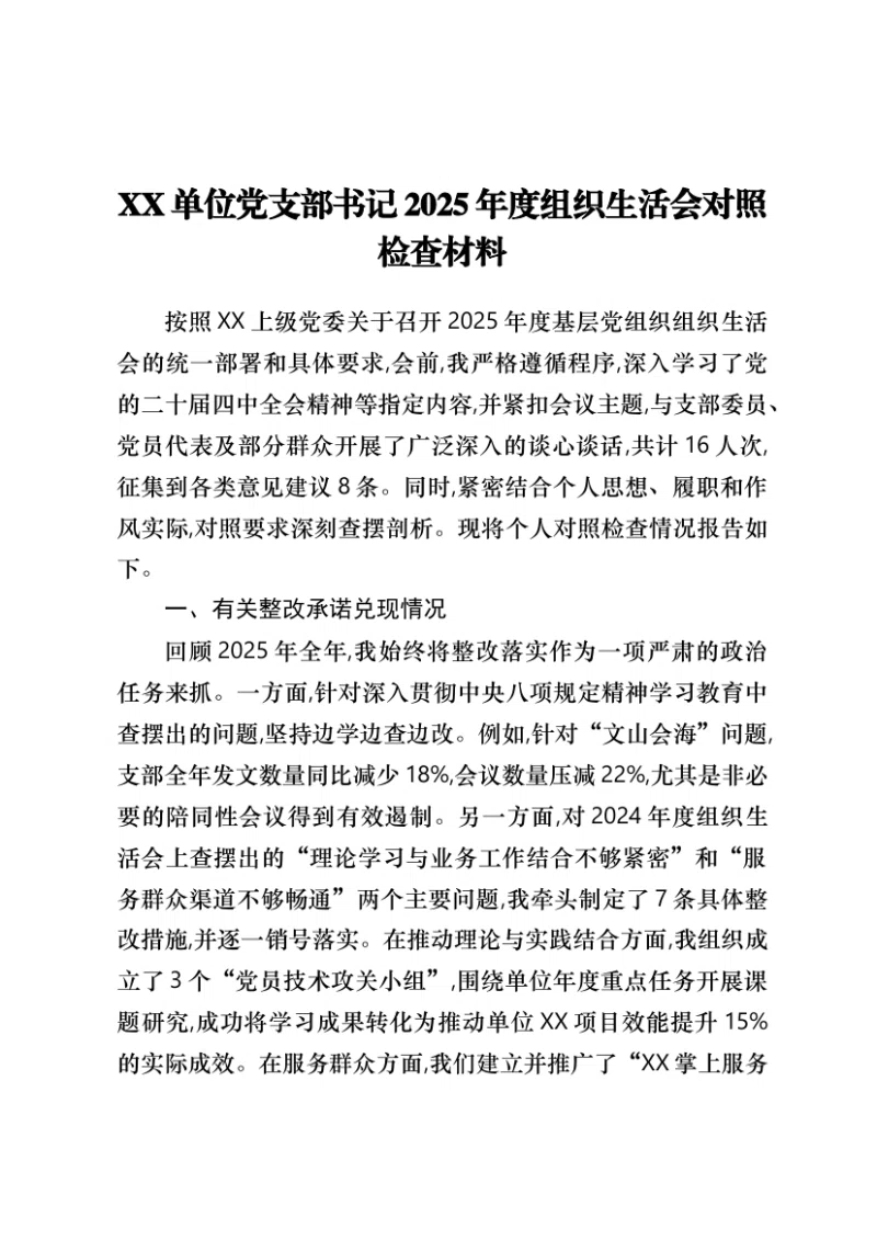 XX单位党支部书记2025年度组织生活会对照检查材料按照XX上级党委关于召开2025年度基层党组织组织生活会的统一部署和具体要求,会前,我严格遵循程序,深入学习了党的二十届四中全会精神等指定内容,并紧扣会议主题,与支部委员、党员代表及部分群众开展了广泛深入的谈心谈话,共计16人次,征集到各类意见建议8条。同时,紧密结合个人思想、履职和作风实际,对照要求深刻查摆剖析。现将个人对照检查情况报告如下。一、有关整改承诺兑现情况回顾2025年全年,我始终将整改落实作为一项严肃的政治任务来抓。一方面,针对深入贯彻中央八项规定精神学习教育中查摆出的问题,坚持边学边查边改。例如,针对“文山会海”问题,支部全年发文数量同比减少18%,会议数量压减22%,尤其是非必要的陪同性会议得到有效遏制。另一方面,对2024年度组织生活会上查摆出的“理论学习与业务工作结合不够紧密”和“服务群众渠道不够畅通”两个主要问题,我牵头制定了7条具体整改措施,并逐一销号落实。在推动理论与实践结合方面,我组织成立了3个“党员技术攻关小组”,围绕单位年度重点任务开展课题研究,成功将学习成果转化为推动单位XX项目效能提升15%的实际成效。在服务群众方面,我们建立并推广了“XX掌上服务平台”,将原有需要线下办理的12项业务流程简化并迁移至线上,全年累计服务职工群众超过3500人次,群众满意度由2024年底的95.2%提升至98.6%。截至目前,2024年度组织生活会承诺的整改事项已全部完成并取得预期效果。二、会前学习研讨与谈心谈话情况为开好本次组织生活会,我严格按照要求,扎实做好各项准备工作。在学习研讨方面,我参加了支委会组织的4次集中学习研讨,重点学习了党的二十届四中全会精神、《中国共产党纪律处分条例》等内容,并利用业余时间系统自学了《习近平著作选读》等重要文献。通过学习,我深刻认识到,推进中国式现代化是一场深刻的社会革命,必须时刻绷紧自我革命这根弦,以彻底的自我革命精神解决党内存在的突出问题。在谈心谈话方面,我与支部全部3名委员、5名党员代表和8名普通群众代表进行了“一对一”的深入交流,累计谈话超过20小时。大家开诚布公,对我个人在工作决策、管理方式和深入基层等方面提出了8条宝贵的意见建议,为我精准查摆问题、深刻剖析根源打下了坚实基础。三、对照检查发现的突出问题紧扣本次组织生活会主题,围绕绷紧自我革命这根弦,我坚持把自己摆进去、把职责摆进去、把工作摆进去,以刀刃向内的勇气,从五个方面深入查摆了自身存在的问题。(一)在学习贯彻党的创新理论方面,存在学用转化不精准的问题。虽然能够完成规定的学习任务,但在“深化、内化、转化”上做得还不够。主要表现为:一是对新理论的理解存在“时差”和“温差”。例如,对于“新质生产力”这一重大理论创新,虽然进行了学习,但在思考如何结合本单位科研和生产实际,寻找具体切入点和突破口上,缺乏系统性、前瞻性的谋划,导致学习成果未能迅速转化为指导工作的具体思路和举措。二是在理论指导实践上存在“两张皮”现象。习惯于用老经验、老办法解决新问题,在2025年推动“XX智能化改造”项目中,面对技术瓶颈,第一反应是寻求外部专家支持,而不是首先运用新发展理念,从优化内部资源配置、激发团队创新活力等根本性问题上想办法、找路径,反映出理论与实践的结合深度不够。(二)在加强党性锤炼方面,存在斗争精神有所弱化的问题。在长期相对平稳的工作环境中,自我感觉党性修养比较过硬,但对照革命先辈和先进典型,发现自己在复杂矛盾和棘手问题面前,敢于斗争、善于斗争的锐气有所消减。主要表现为:一是“和稀泥”思想偶有抬头。在处理一些涉及人员利益调整或部门间协调的敏感问题时,有时为了维护表面的和谐与稳定,倾向于采取折中调和的方式,批评的“辣味”不足,导致一些深层次矛盾未能得到及时有效解决,影响了组织的战斗力。二是攻坚克难的韧劲有所不足。面对单位某项长期存在的管理顽疾,虽然多次组织讨论,也提出了一些改进思路,但因为牵涉面广、阻力较大,未能以“钉钉子”的精神一抓到底,存在畏难情绪和“等靠要”思想。(三)在联系服务群众方面,存在深入基层不接地气的问题。虽然也经常下基层调研,但服务群众的精准性和实效性有待提高。主要表现为:一是调研方式较为单一。多以开座谈会、听汇报等形式进行,与一线职工“坐一条板凳、唠家常嗑”式的交流较少,导致对职工群众最真实、最迫切的需求掌握得不够全面、不够精准。2025年全年我下基层调研25次,但真正通过非正式交流收集到的原创性建议仅有3条。二是解决问题存在“慢半拍”现象。例如,有职工在2025年4月就反映单位食堂晚餐菜品单一、质量不佳的问题,我虽然批示相关部门研究解决,但由于跟踪督办不力,直到9月份才得到明显改善,反映出我“以人民为中心”的立场树得不够牢固,解决群众急难愁盼问题的紧迫感不