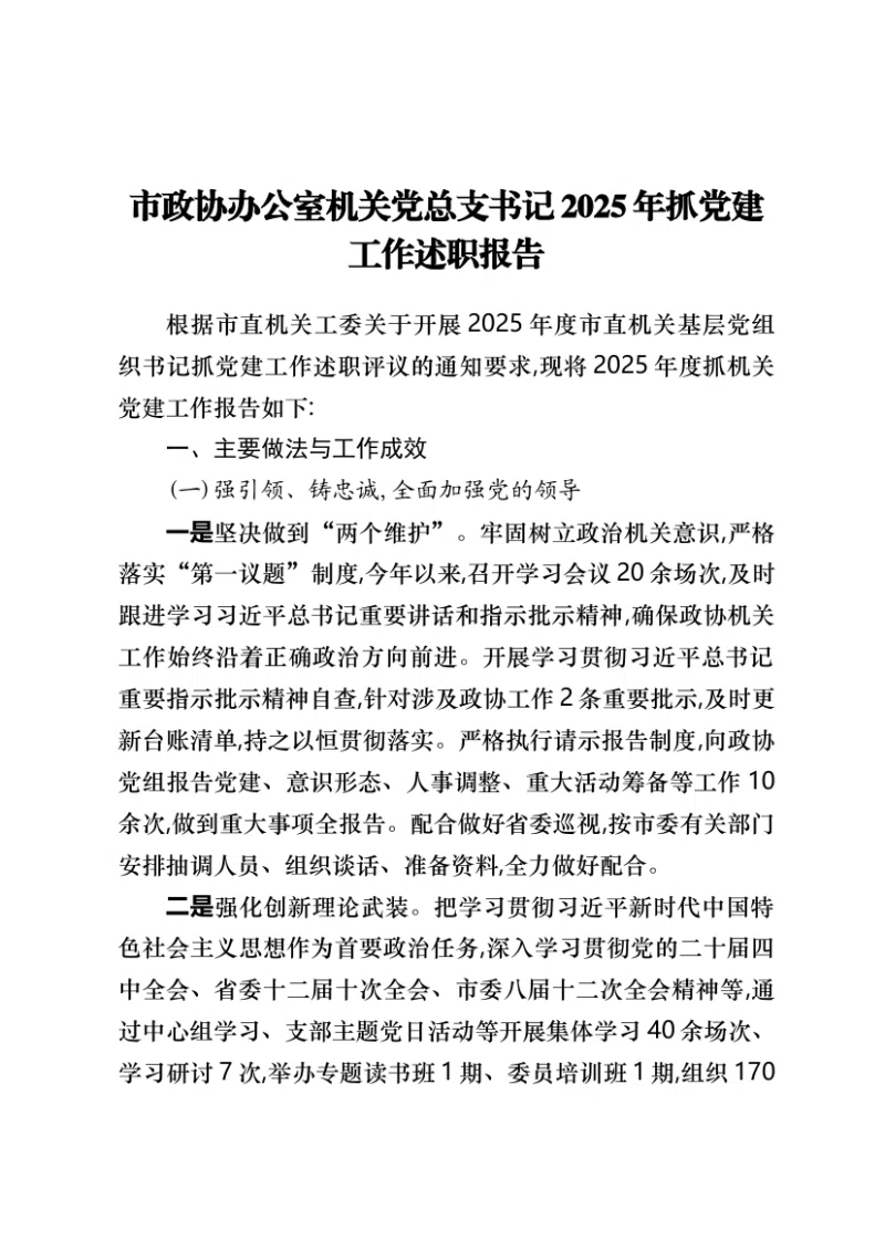 市政协办公室机关党总支书记2025年抓党建工作述职报告根据市直机关工委关于开展2025年度市直机关基层党组织书记抓党建工作述职评议的通知要求,现将2025年度抓机关党建工作报告如下:一、主要做法与工作成效(一)强引领、铸忠诚,全面加强党的领导一是坚决做到“两个维护”。牢固树立政治机关意识,严格落实“第一议题”制度,今年以来,召开学习会议20余场次,及时跟进学习习近平总书记重要讲话和指示批示精神,确保政协机关工作始终沿着正确政治方向前进。开展学习贯彻习近平总书记重要指示批示精神自查,针对涉及政协工作2条重要批示,及时更新台账清单,持之以恒贯彻落实。严格执行请示报告制度,向政协党组报告党建、意识形态、人事调整、重大活动筹备等工作10余次,做到重大事项全报告。配合做好省委巡视,按市委有关部门安排抽调人员、组织谈话、准备资料,全力做好配合。二是强化创新理论武装。把学习贯彻习近平新时代中国特色社会主义思想作为首要政治任务,深入学习贯彻党的二十届四中全会、省委十二届十次全会、市委八届十二次全会精神等,通过中心组学习、支部主题党日活动等开展集体学习40余场次、学习研讨7次,举办专题读书班1期、委员培训班1期,组织170余人次县级干部参加市委学习活动,切实加强思想政治引领、广泛凝聚共识。创新学习方式,建设机关阅览室,用好XX干部在线学习等平台,开展现场研学2次,推动党的创新理论入心入脑。三是守好意识形态阵地。机关党组书记带头履行意识形态工作第一责任人责任,班子其他成员履行意识形态工作直接领导责任,每季度召开党组会议专题研究意识形态工作,定期分析研判意识形态风险,做好政协全会、重大活动、重要节日等关键节点的新闻宣传、舆情监测、舆论引导等工作,确保不出现舆情事件。严格落实“三审三校”机制,强化信息发布前置把关和过程管理,今年以来,通过政协网站、政协公众号等新闻媒体发布信息1000余条,弘扬正能量、唱响主旋律。未发生意识形态领域事件。二、抓党建、强根基,筑牢坚强战斗堡垒一是严肃组织生活。带头以普通党员身份参加双重组织生活,带头开展批评与自我批评,带头为党员干部讲党课2场次,带头与党员干部谈心谈话50余人次,为党员干部作出了表率。今年以来,机关开展组织生活会2场次、支部主题党日活动20场次,其中,赴XX市革命烈士纪念园开展红色教育1场次,联合结对帮扶村开展支部主题党日活动2场次。走访慰问20余名退休党员干部,为3名老党员颁发光荣在党50年纪念章。依托“三会一课”等基本组织制度,把全面从严治党压实到每个支部、落实到每名党员。二是加强支部建设。深入推进“党旗领航·赋能协商”党建品牌建设。严把党员发展入口关,发展2名预备党员。加强党务干部队伍建设,组织13名党务干部参加全市党务干部培训班,整体提升党务干部业务能力。严格落实市委组织部、机关工委各项党建工作任务,持续推进党支部标准化、规范化建设。坚持推动党建业务融合,以党建为引领,各专(工)委组织各界别委员深入开展各类协商议政、民主监督、联谊交流、提案督办等,圆满完成各项既定工作任务。三是坚持党建带群建。支持机关工会组织党员干部参加机关工委组织的“建功支点·机关先行”歌唱比赛,指导工会立足职能,优化机关干部福利待遇落实举措,切实提升干部获得感。支持妇委会开展“爱心妈妈”、“三八妇女节”、“六一儿童节”活动等。及时谋划实施工会、妇委会换届。三、强队伍、提能力,全力服务中心大局一是强化干部提能。制定干部素质提升年活动方案,分层分类、多元施策推动干部培训赋能、实践强能。开展专题辅导。聚焦履职关键领域,开展反映社情民意信息、低空经济等针对性专题辅导培训4场次,200余人次参加。开展分类培训。组织6名干部参加市党校主体班,14名党务干部参加党建培训班,6名干部参加组工业务培训班、人工智能培训班、美丽XX培训班等,选派1名县级干部赴市信访局挂职锻炼。加强实践锻炼。选派党员干部参加重点课题调研工作,今年以来,开展重点专题调研活动10余次,60余人次党员干部参加,在调研实践中党员干部“脚力、眼力、脑力、笔力”不断提升。二是加强管理监督。持续加强干部全方位管理和经常性监督,把工作圈和社交圈、八小时之内和八小时之外、网下和网上等贯通起来,坚持管理监督全覆盖、无死角。组织36名干部填报领导干部个人有关事项,开展干部出国境清理、近亲繁殖自查、违法建设自查、违规从事盈利活动自查、保密自查,督促干部严守各项制度规矩。严格审批干部出国境,依规审批3名干部出国(境)。健全“日常+专项+节点”谈心提醒机制,做到“提拔晋升必谈、岗位变动必谈、组织处理必谈、发现苗头必谈”,谈心提醒20余人次,在重要节日、关键节点及时召开干部大会、发送提醒短信。三是激励担当作为。评选2024年优秀干部及优秀党员,按时开展2025年季度考核,提拔晋升10名党员干部,