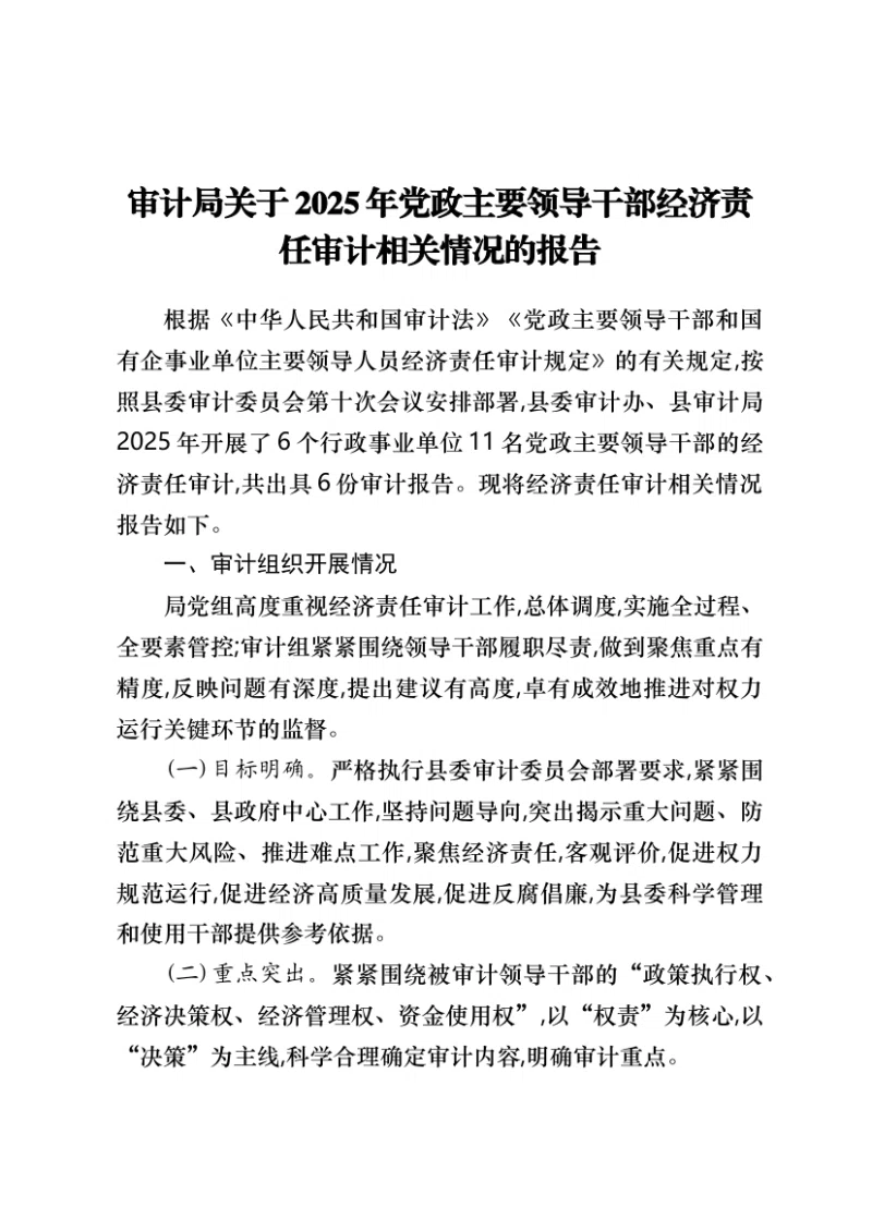 审计局关于2025年党政主要领导干部经济责任审计相关情况的报告根据《中华人民共和国审计法》《党政主要领导干部和国有企事业单位主要领导人员经济责任审计规定》的有关规定,按照县委审计委员会第十次会议安排部署,县委审计办、县审计局2025年开展了6个行政事业单位11名党政主要领导干部的经济责任审计,共出具6份审计报告。现将经济责任审计相关情况报告如下。一、审计组织开展情况局党组高度重视经济责任审计工作,总体调度,实施全过程、全要素管控;审计组紧紧围绕领导干部履职尽责,做到聚焦重点有精度,反映问题有深度,提出建议有高度,卓有成效地推进对权力运行关键环节的监督。(一)目标明确。严格执行县委审计委员会部署要求,紧紧围绕县委、县政府中心工作,坚持问题导向,突出揭示重大问题、防范重大风险、推进难点工作,聚焦经济责任,客观评价,促进权力规范运行,促进经济高质量发展,促进反腐倡廉,为县委科学管理和使用干部提供参考依据。(二)重点突出。紧紧围绕被审计领导干部的“政策执行权、经济决策权、经济管理权、资金使用权”,以“权责”为核心,以“决策”为主线,科学合理确定审计内容,明确审计重点。(三)依法定责。严格按照“三个区分开来”原则,客观公正、实事求是地反映领导干部任职期间经济责任履行情况,肯定成绩,揭示问题,界定责任,促进领导干部守法、守纪、守规、尽责。二、审计总体评价审计结果表明,被审计领导干部(人员)任职期间,能够立足本职,带动本部门(单位)贯彻落实党和国家有关重大经济方针政策,推动本单位事业发展,在重大经济决策和重大事项管理方面能够执行集体决策制度,在经济活动中能够落实有关党风廉政建设责任,遵守廉洁从政(从业)规定。三、审计发现的主要问题审计过程中发现在政策执行,推动部门(单位)事业发展,重大经济决策,重要事项管理以及内部管控等方面问题41个。向被审计单位提出审计建议19条。对审计查出的问题,审计机关依法依规进行了处理,并要求各部门(单位)采取有效措施进行整改,县审计局将持续跟踪督促整改。行政事业单位党政主要领导干部经济责任审计发现问题情况主要包括以下两方面:1.贯彻执行党和国家经济方针政策和上级决策部署方面,存在5个问题。例如未及时收缴产业帮扶入股项目分红款等问题。2.履行财政财务和内部管理职责方面,存在36个问题。例如固定资产管理不规范,账实不符等问题。四、审计建议(一)强化履职尽责,提高依法行政和科学管理能力。一是增强领导干部依法行政的理念,提高依法决策、科学决策、依法管理、科学管理的能力。二是增强领导干部贯彻执行党和国家有关经济工作方针政策、决策部署和有关法律法规意识,促进领导干部依法履职。三是督促被审计单位整章建制,建立健全机制体制,从源头上堵塞漏洞,从根本上解决问题,避免问题屡查屡犯。(二)强化内控建设,提高风险管控意识和能力。一是建立健全内控机构,完善内部审计制度和流程,充分发挥内部审计机构的作用。二是严格执行内控制度,本着“制度管人,流程管事”的原则,增强内部控制意识,补足短板,提高风险管控,在实施有效风险控制的基础上,提升管理水平。三是及时深入地对各类业务风险进行排查,对排查发现的问题建立台账,逐条整改落实,切实提高风险管控意识和发展的能力。(三)强化资金管理,提高资金的使用效益。一是行政和事业单位要严格按照《中华人民共和国预算法》的要求编制预算,加强预算编制的科学性和准确性,提高预算执行率。二是将各单位预算执行和绩效管理纳入领导干部考核内容,提高资金管理使用的科学性和有效性,促使国有资金充分发挥经济效益和社会效益。(四)强化责任落实,推进经济责任审计结果运用。一是认真落实经济责任审计情况通报、责任追究等制度。二是明确整改责任,列出整改清单,建立整改台账,及时反馈整改结果。三是将经济责任审计结果以及落实整改责任情况作为考核、任免、奖惩被审计领导干部的重要参考依据。