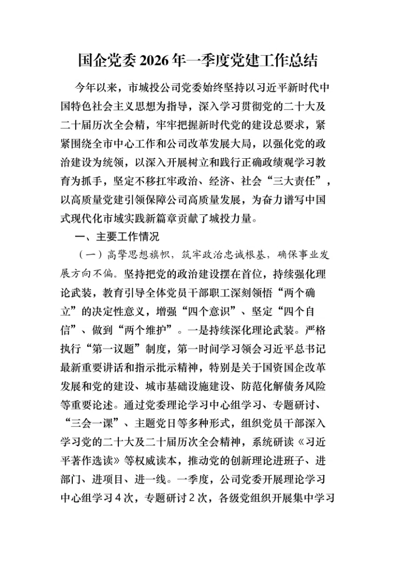 国企党委2026年一季度党建工作总结今年以来,市城投公司党委始终坚持以习近平新时代中国特色社会主义思想为指导,深入学习贯彻党的二十大及二十届历次全会精,牢牢把握新时代党的建设总要求,紧紧围绕全市中心工作和公司改革发展大局,以强化党的政治建设为统领,以深入开展树立和践行正确政绩观学习教育为抓手,坚定不移扛牢政治、经济、社会“三大责任”,以高质量党建引领保障公司高质量发展,为奋力谱写中国式现代化市域实践新篇章贡献了城投力量。一、主要工作情况(一)高擎思想旗帜,筑牢政治忠诚根基,确保事业发展方向不偏。坚持把党的政治建设摆在首位,持续强化理论武装,教育引导全体党员干部职工深刻领悟“两个确立”的决定性意义,增强“四个意识”、坚定“四个自信”、做到“两个维护”。一是持续深化理论武装。严格执行“第一议题”制度,第一时间学习领会习近平总书记最新重要讲话和指示批示精神,特别是关于国资国企改革发展和党的建设、城市基础设施建设、防范化解债务风险等重要论述。通过党委理论学习中心组学习、专题研讨、“三会一课”、主题党日等多种形式,组织党员干部深入学习党的二十大及二十届历次全会精神,系统研读《习近平著作选读》等权威读本,推动党的创新理论进班子、进部门、进项目、进一线。一季度,公司党委开展理论学习中心组学习4次,专题研讨2次,各级党组织开展集中学习百余场次,党员干部政治判断力、政治领悟力、政治执行力得到新提升。二是扎实开展树立和践行正确政绩观学习教育。根据中央和省、市委部署要求,公司党委迅速行动,将树立和践行正确政绩观学习教育作为一季度党建工作的重中之重。制定了《市城投公司党委关于开展树立和践行正确政绩观学习教育的实施方案》,召开了动员部署会。重点组织学习了习近平总书记关于树立和践行正确政绩观的一系列重要论述,引导党员干部深刻把握“政绩为谁而树、树什么样的政绩、靠什么树政绩”的根本问题。结合公司实际,围绕“在城市建设与更新中如何创造经得起历史、实践和人民检验的实绩”、“如何处理好显绩与潜绩、当前与长远的关系”、“在防范化解债务风险、推动公司转型发展中如何担当作为”等主题开展专题研讨3次。教育引导党员干部坚持以人民为中心的发展思想,完整、准确、全面贯彻新发展理念,坚决防止和克服急功近利、竭泽而渔、脱离实际、华而不实等不良倾向,切实把正确政绩观落实到谋划重大项目、推动重点工作、解决发展难题的全过程。三是严明政治纪律和政治规矩。始终胸怀“国之大者”,自觉将公司工作放在全市经济社会发展大局中思考和推进,确保中央大政方针和省、市决策部署在公司不折不扣落地生根。严格执行重大事项请示报告制度,一季度就重大投资决策、重要人事任免、重大项目安排等事项向市委、市政府及市国资委请示报告10余次。坚决肃清流毒影响,持续净化公司政治生态,引导党员干部始终做政治上的“明白人”、“老实人”。(二)聚焦主责主业,强化党建引领保障,服务全市发展大局有力。坚持围绕发展抓党建、抓好党建促发展,推动党建工作与生产经营、项目建设、投融资管理、风险防控等中心工作深度融合,以改革发展成果检验党建工作成效。一是党建引领重点项目攻坚。充分发挥基层党组织战斗堡垒作用和党员先锋模范作用,在重大项目建设一线设立“党员责任区”15个、“党员示范岗”30个、组建“党员突击队”8支。有力保障了城市轨道交通3号线一期、市综合交通枢纽西广场、北湖生态修复与提升工程、智慧城市大数据中心等一批省市重点项目建设顺利推进,一季度累计完成固定资产投资约*亿元,实现“开门红”。特别是在面对复杂地质条件、征拆难题时,党员干部冲锋在前,带头攻坚克难,确保了工程节点的按时达成。二是推动战略转型与产业升级。党委把方向、管大局、促落实,深入研究国家宏观政策导向和区域发展战略,结合“十五五”规划谋划,进一步明确了公司“城市综合运营服务商”的战略定位。优化调整业务布局,在巩固传统基础设施投融资建设优势的同时,积极向城市更新、片区综合开发、智慧停车、新能源基础设施、环保水务、保障性住房建设等领域拓展。一季度,成功中标城南片区城市更新(一期)项目,启动了全市公共停车资源一体化运营平台建设前期工作,在培育新业务增长点上迈出坚实步伐。三是强化风险防控与合规管理。党委高度重视防范化解重大风险,定期专题研究债务风险、投资风险、安全稳定风险等。严格落实中央关于地方政府债务管理的要求,优化债务结构,稳妥化解存量债务,一季度实现高成本债务置换*亿元,整体融资成本稳中有降。深化“大监督”体系建设,纪检、审计、法务、财务、内控等部门协同联动,聚焦工程招投标、物资采购、资金支付、资产处置、产权交易等重点领域和关键环节,开展专项监督检查2次,发现问题线索*条,均按程序处置。持续加强安全生产管理,层层压实责任,一季度未发生较大及以上安全生产责任事故。(三)夯实基层基础,建强