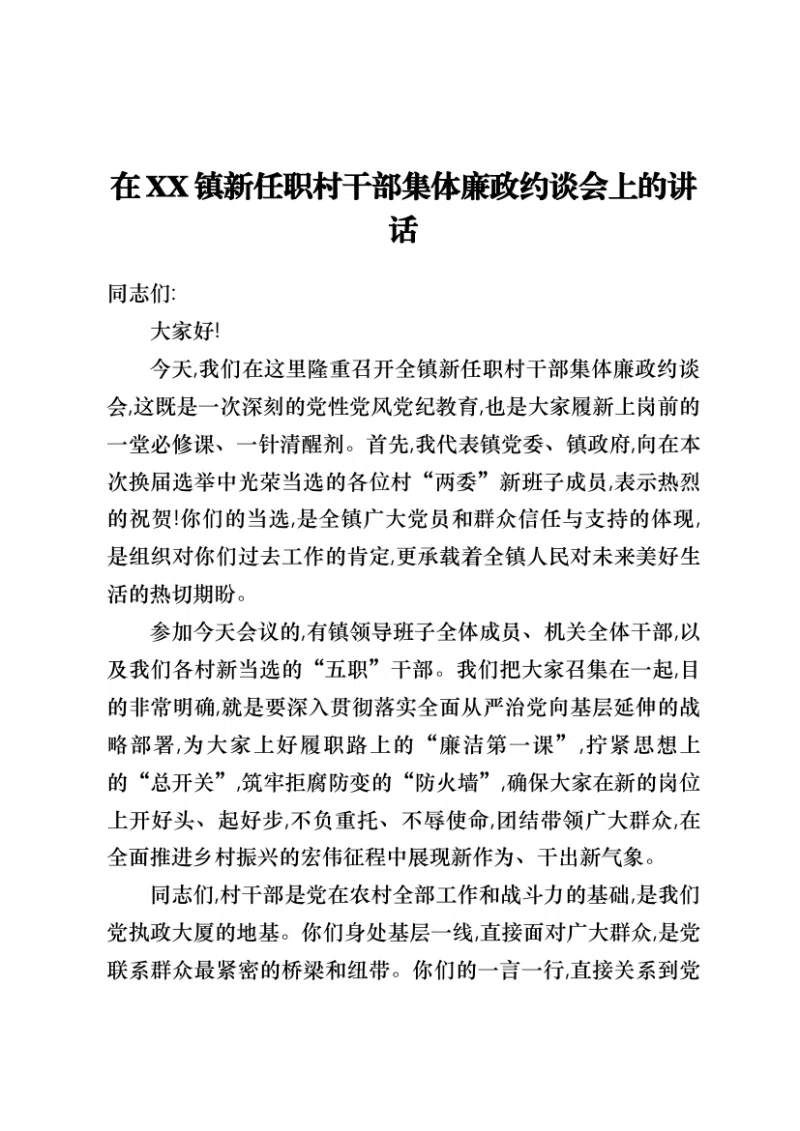 在XX镇新任职村干部集体廉政约谈会上的讲话同志们:大家好!今天,我们在这里隆重召开全镇新任职村干部集体廉政约谈会,这既是一次深刻的党性党风党纪教育,也是大家履新上岗前的一堂必修课、一针清醒剂。首先,我代表镇党委、镇政府,向在本次换届选举中光荣当选的各位村“两委”新班子成员,表示热烈的祝贺!你们的当选,是全镇广大党员和群众信任与支持的体现,是组织对你们过去工作的肯定,更承载着全镇人民对未来美好生活的热切期盼。参加今天会议的,有镇领导班子全体成员、机关全体干部,以及我们各村新当选的“五职”干部。我们把大家召集在一起,目的非常明确,就是要深入贯彻落实全面从严治党向基层延伸的战略部署,为大家上好履职路上的“廉洁第一课”,拧紧思想上的“总开关”,筑牢拒腐防变的“防火墙”,确保大家在新的岗位上开好头、起好步,不负重托、不辱使命,团结带领广大群众,在全面推进乡村振兴的宏伟征程中展现新作为、干出新气象。同志们,村干部是党在农村全部工作和战斗力的基础,是我们党执政大厦的地基。你们身处基层一线,直接面对广大群众,是党联系群众最紧密的桥梁和纽带。你们的一言一行,直接关系到党和政府在人民群众心中的形象;你们的工作作风和成效,直接决定着我们乡村振兴战略的实施质量,决定着农村的和谐稳定,决定着广大农民群众的切身利益。可以说,岗位看似不大,但责任重于泰山。我们必须清醒地认识到,基层岗位从来不是廉政风险的“真空地带”,随着乡村振兴的深入推进,项目、资金、资源越来越多地向农村倾斜,村干部手中掌握的权力也随之增大,面临的考验和诱惑也日益增多。因此,召开这次廉政约谈会,既是形势所需,也是履职所要,更是关爱保护我们干部的具体体现。希望大家能够深刻领会会议的重要意义,将今天的约谈内容内化于心、外化于行,时刻绷紧廉洁自律这根弦,将清正廉洁作为履职尽责的根本前提和底线要求,把铁的纪律转化为日常习惯和自觉遵循,以过硬的政治素质、扎实的工作作风和清廉的公仆形象,向党和人民交上一份满意的答卷。下面,结合我们XX镇的实际情况和大家即将面临的工作任务,我讲四点意见。一、铸牢思想根基,在加强理论武装中把稳政治方向盘思想是行动的先导,理论是实践的指南。作为农村基层的“领头雁”,政治上的清醒和坚定是第一位的。只有思想根基牢固,才能在各种风浪考验面前站稳脚跟,才能在各种诱惑面前保持定力。一要坚定政治信仰,补足精神之钙。理想信念是共产党人精神上的“钙”,没有理想信念,或者理想信念不坚定,精神上就会“缺钙”,就会得“软骨病”。大家要坚持把学习贯彻党的创新理论作为首要政治任务,持续深入学习领会习近平新时代中国特色社会主义思想,深刻把握其核心要义、精神实质和实践要求。要通过学习,深刻领悟“两个确立”的决定性意义,增强“四个意识”、坚定“四个自信”、做到“两个维护”,不断提高政治判断力、政治领悟力、政治执行力,确保在任何时候、任何情况下都同党中央保持高度一致,确保党的路线方针政策在农村基层不折不扣地得到贯彻执行。二要精通政策业务,增强履职之能。乡村振兴是一项系统工程,政策性强、涉及面广,不懂政策、不熟悉业务,就无法带领群众科学发展。大家要下大力气学习中央和省、市、县关于全面推进乡村振兴的各项决策部署,准确把握产业发展、乡村建设、基层治理等方面的政策要求。特别是要结合我们XX镇的发展实际,围绕特色种植、科学养殖、农文旅融合这“三篇文章”,深入研究如何将政策红利转化为实实在在的发展成果。例如,我们镇正在推进的“镇村一体农文旅养融合发展”综合开发项目,就需要大家深入学习相关政策,积极配合项目落地,引导群众参与,确保项目顺利实施并惠及广大村民。只有自己先学懂弄通,才能当好群众的“主心骨”和“引路人”。三要深化警示教育,常敲律己之钟。廉洁自律的防线,首先要从思想上筑起。反面典型案例是我们最现实、最深刻的教科书。镇纪委将常态化组织大家观看警示教育片、通报典型案例、参观廉政教育基地。大家要从这些发生在身边的案例中深刻汲取教训,看一看那些曾经的同事、身边的人是如何一步步滑向腐败深渊的,想一想他们给党和人民事业造成的损害,给家庭和个人带来的无尽悔恨。要以案为鉴、以案明纪,深刻反思自身在思想、作风、纪律等方面存在的苗头性、倾向性问题,做到见不贤而内自省,知敬畏、存戒惧、守底线,坚决不触碰纪律“高压线”,不逾越法律“红线”,真正把廉洁自律的要求融入到村级产业发展、民生改善、环境整治等各项重点工作的全过程。二、压实主体责任,在规范权力运行中织密制度防护网权力是人民赋予的,只能用来为人民谋利益。村干部手中的权力虽然不大,但如果失去监督和约束,同样会滋生腐败,损害群众利益,侵蚀党的执政根基。因此,必须把制度的笼子扎得更紧更密,确保权力在阳光下运行。一是要扛牢管党治党第一责任。村党组织书记作为村级组织的第一责任人,必须牢固树立“