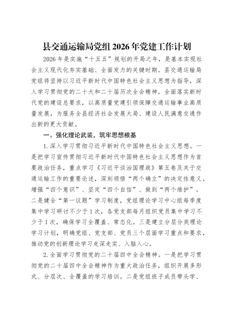 县交通运输局党组2026年党建工作计划2026年是实施“十五五”规划的开局之年,是基本实现社会主义现代化夯实基础、全面发力的关键时期。县交通运输局党组将坚持以习近平新时代中国特色社会主义思想为指导,深入学习贯彻党的二十大和二十届历次全会精神,全面落实新时代党的建设总要求,以高质量党建引领保障交通运输事业高质量发展,为服务全县经济社会发展大局、建设人民满意交通作出新的更大贡献。一、强化理论武装,筑牢思想根基1.深入学习贯彻习近平新时代中国特色社会主义思想。一是把学习宣传贯彻习近平新时代中国特色社会主义思想作为首要政治任务,重点学习《习近平谈治国理政》第五卷及关于交通运输工作的重要论述,深刻领悟“两个确立”的决定性意义,增强“四个意识”、坚定“四个自信”、做到“两个维护”。二是健全“第一议题”学习制度,党组理论学习中心组每季度集中学习研讨不少于1次,各党支部每月组织党员集中学习不少于1次,确保学习全覆盖、常态化。三是建立分层分类理论学习计划,明确党组、党支部、党员三个层面学习重点和要求,推动党的创新理论学习走深走实、入脑入心。2.全面学习贯彻党的二十届四中全会精神。一是把学习贯彻党的二十届四中全会精神作为重大政治任务,组织开展多形式、分层次、全覆盖的学习培训。二是党组班子成员带头学、深入学,通过理论学习中心组学习、专题研讨等形式,准确把握全会提出的重大判断、重要部署。三是组织各党支部开展集中学习研讨,举办专题培训班,邀请专家学者或上级领导进行辅导讲座。四是开展多层次宣讲活动,党组班子成员带头到分管领域、基层联系点讲党课,推动全会精神在交通运输系统深入人心、落地见效。3.完善党员干部理论教育培训长效机制。一是制定年度党员干部教育培训计划,明确培训对象、内容、方式和要求。二是建立党组、党支部、党小组三级培训体系,分级分类开展教育培训。局党组每年至少组织2次覆盖全体党务干部和基层党支部书记的专业化培训。各党支部每季度至少组织1次党员集中培训。三是创新培训方式,综合运用专题讲座、现场教学、案例教学、网络学习等多种形式,增强培训的针对性和实效性。四是建立培训档案,完善学时登记、考核评价等制度,确保培训质量。4.加强年轻干部和青年理论学习。一是把党的创新理论学习作为青年学习“第一任务”,推动青年理论学习走深走实。二是建立健全青年理论学习小组,配齐配强指导教师,制定学习计划,规范学习制度。三是创新青年教育管理引导方式,开展青年干部读书班、理论研讨会、知识竞赛、岗位练兵等活动。四是把青年理论学习小组建设成为发现、培养、锻炼青年干部的重要平台,注重选拔理论功底扎实、政治素质过硬的优秀青年进入后备干部队伍。二、压实主体责任,强化组织建设5.严格落实党建工作责任制。一是局党组切实履行全面从严治党主体责任,党组书记履行第一责任人职责,班子成员认真履行“一岗双责”,抓好分管领域和单位的党建工作。二是建立党建工作责任清单,明确党组、党支部、党员三个层面的职责任务。三是定期召开党组会议,听取党建工作汇报,研究解决重点难点问题。四是建立党支部书记抓党建工作述职评议考核制度,考核结果与评优评先、干部使用等挂钩。6.推进党支部标准化规范化建设。一是认真落实《中国共产党支部工作条例(试行)》,健全党支部各项制度,规范党内组织生活。二是严格执行“三会一课”制度,确保组织生活经常化、制度化、规范化。三是提升主题党日活动质量,每月相对固定1天开展主题党日,精心设计活动内容,与交通业务、志愿服务、廉政教育等相结合。四是加强党员教育管理,健全在职党员、离退休党员分类管理制度,做好流动党员组织关系管理。7.深入开展软弱涣散党组织整顿。一是建立健全软弱涣散党组织排查整顿机制,每年开展1次集中排查。二是对班子不团结、组织生活不正常、党员作用发挥不明显的党组织,制定“一支部一策”整顿方案。三是加强分类指导,党组班子成员挂钩联系整顿对象,定期督导检查。四是建立整顿销号制度,整顿达标一个、验收销号一个,确保取得实效。8.加强党务干部队伍建设。一是按照“政治强、业务精、作风好”的要求,选优配强专兼职党务干部。二是把党务工作岗位作为培养锻炼复合型干部的重要平台,加大党务干部和业务干部双向交流力度。三是建立党务干部培养使用机制,对表现优秀、业绩突出的优先提拔使用。四是落实激励保障措施,开展优秀共产党员、优秀党务工作者和先进基层党组织评选表彰。三、深化融合发展,服务中心大局9.完善党建与业务工作深度融合机制。一是坚持党建工作与交通业务工作同谋划、同部署、同落实、同检查。二是健全重大事项决策机制,把党的领导融入交通运输规划、建设、管理、运营、执法各环节。三是建立党建工作与业务工作联动考核机制,将党建工作成效纳入单位绩效考核和干部考核评价体系。四是在重大项目、重点任务推进中同步设立党组织、配强党务力量