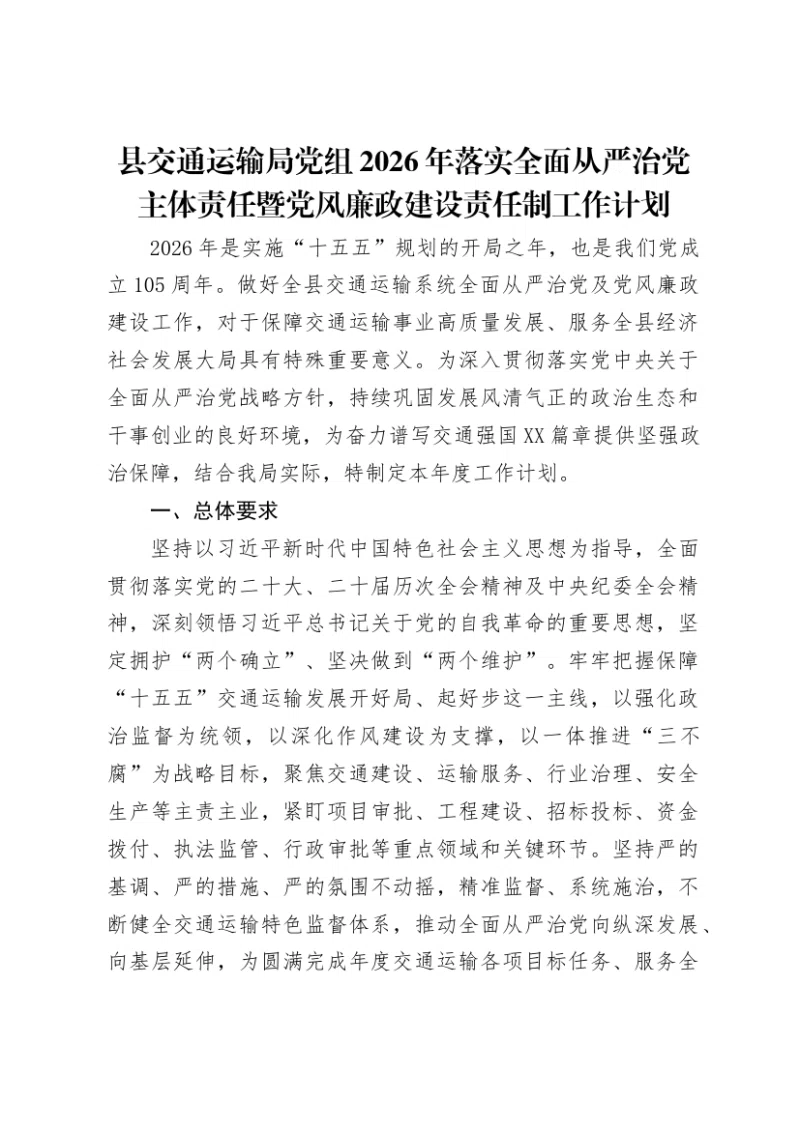 县交通运输局党组2026年落实全面从严治党主体责任暨党风廉政建设责任制工作计划2026年是实施“十五五”规划的开局之年,也是我们党成立105周年。做好全县交通运输系统全面从严治党及党风廉政建设工作,对于保障交通运输事业高质量发展、服务全县经济社会发展大局具有特殊重要意义。为深入贯彻落实党中央关于全面从严治党战略方针,持续巩固发展风清气正的政治生态和干事创业的良好环境,为奋力谱写交通强国XX篇章提供坚强政治保障,结合我局实际,特制定本年度工作计划。一、总体要求坚持以习近平新时代中国特色社会主义思想为指导,全面贯彻落实党的二十大、二十届历次全会精神及中央纪委全会精神,深刻领悟习近平总书记关于党的自我革命的重要思想,坚定拥护“两个确立”、坚决做到“两个维护”。牢牢把握保障“十五五”交通运输发展开好局、起好步这一主线,以强化政治监督为统领,以深化作风建设为支撑,以一体推进“三不腐”为战略目标,聚焦交通建设、运输服务、行业治理、安全生产等主责主业,紧盯项目审批、工程建设、招标投标、资金拨付、执法监管、行政审批等重点领域和关键环节。坚持严的基调、严的措施、严的氛围不动摇,精准监督、系统施治,不断健全交通运输特色监督体系,推动全面从严治党向纵深发展、向基层延伸,为圆满完成年度交通运输各项目标任务、服务全县高质量发展提供坚强纪律和作风保障。二、主要内容(一)聚焦“国之大者”,以强有力的政治监督保障交通决策部署落地见效始终将政治监督置于首位,确保党中央重大决策部署及省委、市委、县委关于交通运输工作的要求不折不扣落实到位。1.保障重大战略任务实施。一是围绕“十五五”综合交通规划开局起步,聚焦交通强国建设试点、国家重大战略通道建设、综合立体交通网主骨架构建、城乡交通一体化发展等重大任务在本县的落地实施,建立专项监督台账。二是紧盯年度交通固定资产投资计划、重大交通项目建设(如高速公路连接线、国省干线升级改造、农村公路提档升级、客货运枢纽站场、渡口码头改造等)、“四好农村路”高质量发展、运输结构调整、绿色智慧交通发展等重点工作,实施清单化管理、嵌入式监督。三是严肃查处在规划执行、项目推进、政策落实中打折扣、搞变通、做选择,以及有令不行、有禁不止等问题,确保交通发展始终沿着正确方向前进。2.严明政治纪律规矩。一是把遵守党的政治纪律和政治规矩情况作为监督重点,坚决纠治“七个有之”问题,严肃查处对党不忠诚不老实、阳奉阴违的“两面人”“两面派”。二是加强对党章党规党纪执行情况的监督检查,督促各级党组织和党员干部始终在思想上政治上行动上同党中央保持高度一致。三是强化对“一把手”和领导班子落实全面从严治党责任、执行民主集中制、依规依法履职用权等情况的监督,特别是对“三重一大”决策制度执行情况的监督,规范交通领域重大事项决策权。3.推动树立和践行正确政绩观。一是组织开展“树立和践行正确交通政绩观”专题学习教育,纳入党组理论学习中心组学习、支部“三会一课”、干部教育培训重要内容,深入学习领会习近平总书记关于树立和践行正确政绩观的重要论述。二是引导党员干部深刻理解“为谁创造业绩、创造什么样的业绩、怎样创造业绩”的根本问题,坚决反对和纠治在交通建设中脱离实际、盲目举债、重复建设,搞“形象工程”“政绩工程”,以及数据造假、虚报进度等行为。三是在交通规划编制、项目立项评审、设计变更、资金安排、质量评定、运营评价等环节加强监督制约,注重评估项目的长远经济效益、社会效益和生态效益,推动建设人民满意交通。四是建立符合正确政绩观要求的考核评价机制,将群众满意度、安全效益、生态环保等纳入考核指标体系。(二)深化作风建设,以钉钉子精神锲而不舍落实中央八项规定精神坚持常抓不懈、久久为功,持续加固中央八项规定精神堤坝,推动交通系统作风持续向好。4.从严整治享乐奢靡歪风。一是紧盯隐形变异新动向,对违规收送名贵特产和礼品礼金、违规接受管理和服务对象宴请、违规配备使用公车、私车公养、违规发放津补贴、借考察培训之机公款旅游等顽瘴痼疾,保持高压态势。二是针对可能存在的以交通调研、项目检查、协调工作等名义变相公款吃喝、违规报销费用等问题开展专项检查。三是严格规范公务接待、会议培训、差旅报销等标准与程序,强化财务审核和内部审计,坚决防止“四风”问题反弹回潮。5.重拳纠治形式主义官僚主义。一是聚焦影响交通决策部署落实、加重基层负担的突出问题,重点纠治文山会海、督查检查考核过多过频、工作过度留痕、责任“甩锅”、推诿扯皮等问题。二是严肃查处交通运输行政审批、行政执法、政务服务中态度生硬、效率低下、吃拿卡要、随意执法、选择性执法等损害群众和企业利益的行为。三是推动建立健全为基层减负长效机制,引导党员干部把更多时间和精力投入到抓落实、促发展、保安全上来。6.健全作风建设常态机制。一是坚持党性党风党纪一起抓,将作风建
