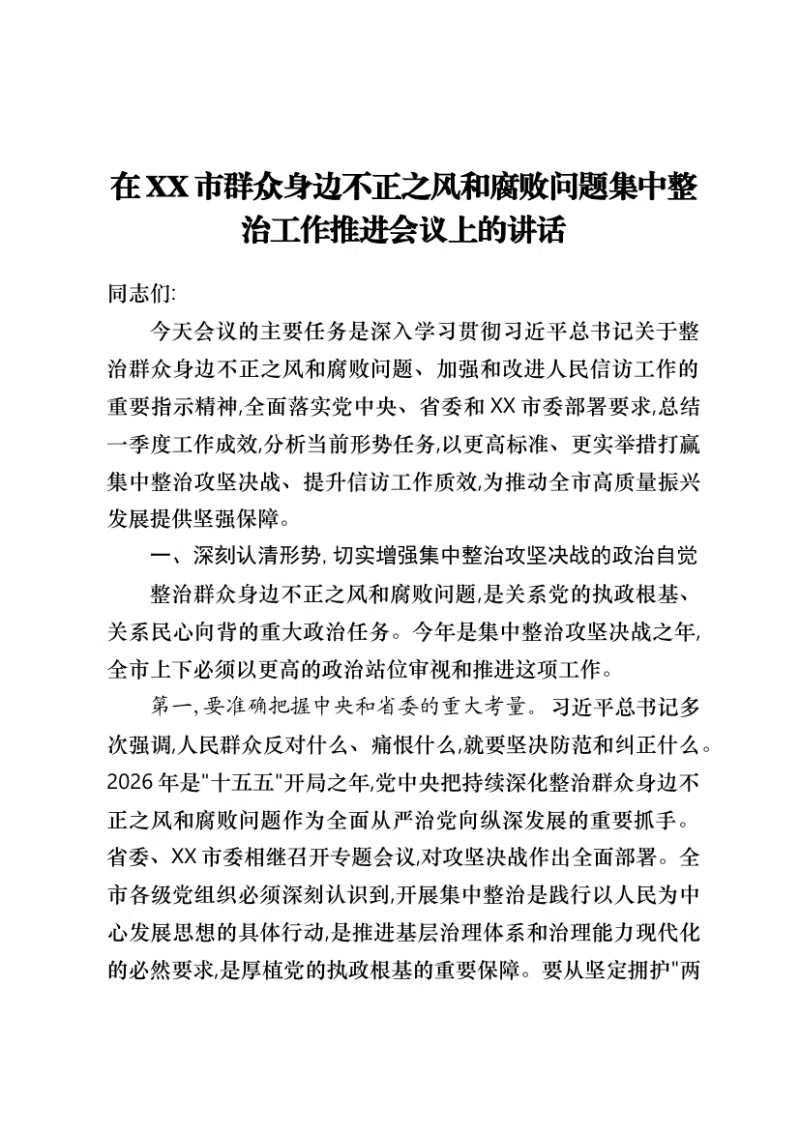 在XX市群众身边不正之风和腐败问题集中整治工作推进会议上的讲话同志们:今天会议的主要任务是深入学习贯彻习近平总书记关于整治群众身边不正之风和腐败问题、加强和改进人民信访工作的重要指示精神,全面落实党中央、省委和XX市委部署要求,总结一季度工作成效,分析当前形势任务,以更高标准、更实举措打赢集中整治攻坚决战、提升信访工作质效,为推动全市高质量振兴发展提供坚强保障。一、深刻认清形势,切实增强集中整治攻坚决战的政治自觉整治群众身边不正之风和腐败问题,是关系党的执政根基、关系民心向背的重大政治任务。今年是集中整治攻坚决战之年,全市上下必须以更高的政治站位审视和推进这项工作。第一,要准确把握中央和省委的重大考量。习近平总书记多次强调,人民群众反对什么、痛恨什么,就要坚决防范和纠正什么。2026年是"十五五"开局之年,党中央把持续深化整治群众身边不正之风和腐败问题作为全面从严治党向纵深发展的重要抓手。省委、XX市委相继召开专题会议,对攻坚决战作出全面部署。全市各级党组织必须深刻认识到,开展集中整治是践行以人民为中心发展思想的具体行动,是推进基层治理体系和治理能力现代化的必然要求,是厚植党的执政根基的重要保障。要从坚定拥护"两个确立"、坚决做到"两个维护"的政治高度,切实增强推进集中整治的责任感和紧迫感。第二,要在总结成效中坚定信心决心。今年以来,全市上下认真贯彻中央和省委决策部署,聚焦"4+2"专项整治与"10+2"民生实事,逐项建立清单、明确责任、时限和标准,实行项目化、专班化推进,取得了阶段性成效。各级纪检监察机关坚持有案必查、有腐必惩,查处了一批群众反映强烈的突出问题,推动解决了一批群众急难愁盼问题,群众获得感、幸福感、安全感持续增强。一季度,全市信访举报总量同比下降,检举控告类信访件明显减少,群众满意度稳步提升。这些成绩的取得,充分证明中央决策部署完全正确,省委工作要求切中要害,全市各级党组织和纪检监察机关执行力强、战斗力强。第三,要在看到不足中找准短板差距。在肯定成绩的同时,必须清醒认识到工作中还存在的突出问题。一是个别单位政治站位不够高,对集中整治的重要性和紧迫性认识不足,存在等靠观望、被动应付的现象,工作开展不平衡、责任落实不到位的问题依然存在。二是案件查办质量有待提升,有的地方线索处置不够及时,案件查办不够深入,"查否率"偏高,以案促改、以案促治效果不够明显。三是民生实事推进不够有力,部分民生项目进展缓慢,群众急难愁盼问题解决不够彻底,民生领域信访问题化解压力依然较大。四是长效机制建设还不够完善,整治成果固化转化不够充分,问题反弹回潮风险依然存在。对这些问题,必须高度重视,采取有力措施加以解决。二、聚焦重点任务,全面提升集中整治攻坚决战的工作质效集中整治进入攻坚决战阶段,必须坚持问题导向、目标导向、结果导向相统一,以过硬作风和扎实成效夺取全面胜利。第一,要聚焦"4+2"专项整治靶向发力。"4+2"专项整治是集中整治的核心抓手,必须作为重中之重抓紧抓实。一要紧盯关键领域精准施治。围绕教育医疗、养老社保、安全生产、食品药品安全等民生重点领域,深入排查群众反映强烈的突出问题,建立问题清单、责任清单、整改清单,实行销号管理。对群众反映强烈、社会影响恶劣的典型案件,要坚决查处、通报曝光,形成强大震慑。二要加大案件查办力度。坚持无禁区、全覆盖、零容忍,对群众身边不正之风和腐败问题发现一起、查处一起,绝不姑息迁就。强化案件查办的法治意识、程序意识、证据意识,确保每一起案件都经得起法律和历史的检验。深化运用监督执纪"四种形态",实现政治效果、纪法效果、社会效果有机统一。三要深化标本兼治。坚持办案、整改、治理一体推进,做好案件查办"后半篇文章",深入剖析案件发生的深层次原因,查找制度漏洞和监管盲区,推动相关职能部门完善制度机制,从源头上铲除腐败滋生土壤。第二,要持续办好"10+2"民生实事。"10+2"民生实事是集中整治的重要载体,直接关系群众切身利益。一要逐项建立任务清单。对每一件民生实事,都要明确具体目标、责任单位、时间节点、工作标准,实行挂图作战、倒排工期,确保按时保质完成任务。二要着力解决群众急难愁盼。深入基层一线,倾听群众呼声,回应群众关切,把群众反映强烈的难点堵点问题作为整治重点,推动问题就地解决、矛盾就地化解。三要完善民生实事推进机制。建立定期调度、督查通报、考核评价机制,对进展缓慢、推诿扯皮的单位和个人严肃追责问责,确保民生实事真正惠及群众。四要健全常态长效防控机制。坚持当下改与长久立相结合,把整治过程中的好经验好做法固化为制度成果,建立健全民生领域权力运行制约和监督机制,堵塞制度漏洞,防止问题反弹。第三,要推进反馈问题闭环整改。对中央、省委督导检查和上级巡视巡察反馈的问题,必须以严肃认真的态度抓好整改落实。一要压实整改责任