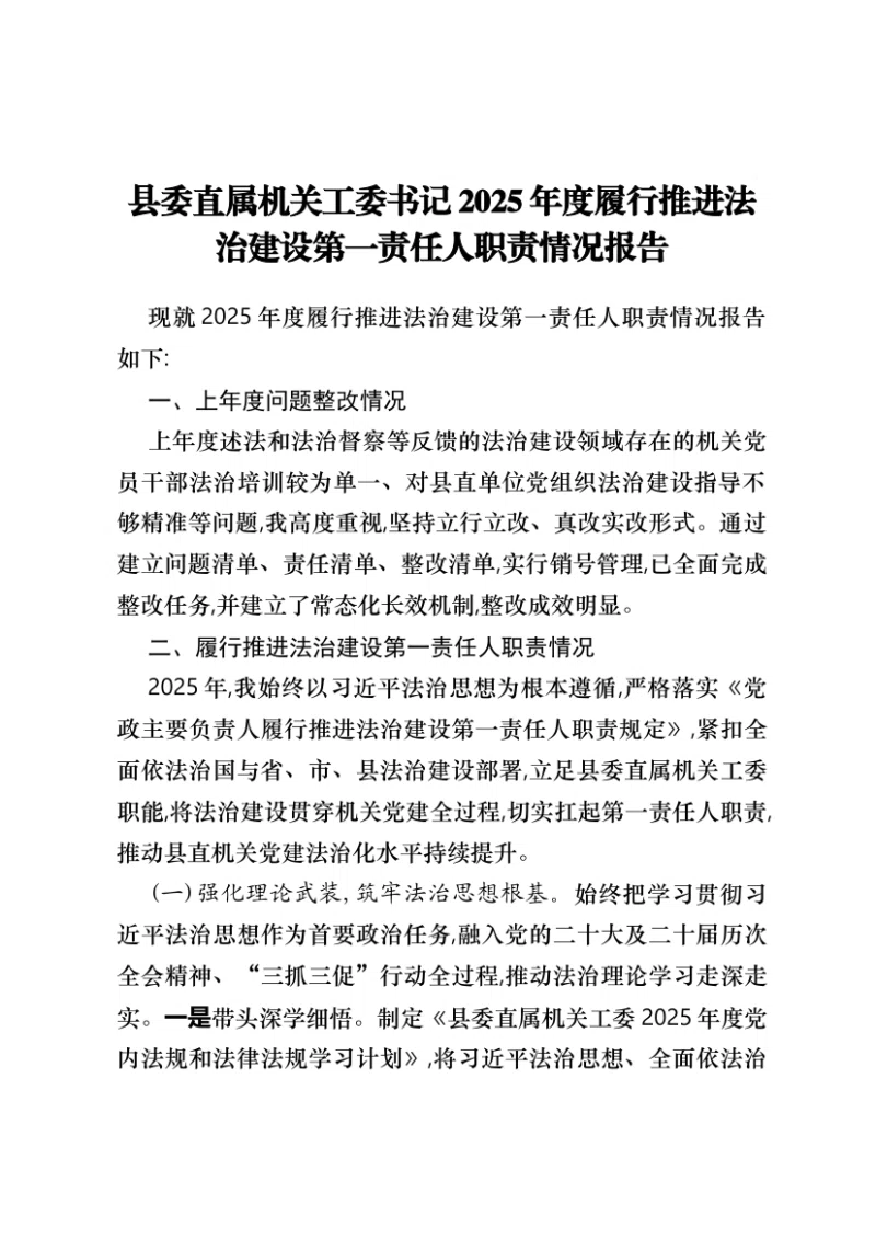 县委直属机关工委书记2025年度履行推进法治建设第一责任人职责情况报告现就2025年度履行推进法治建设第一责任人职责情况报告如下:一、上年度问题整改情况上年度述法和法治督察等反馈的法治建设领域存在的机关党员干部法治培训较为单一、对县直单位党组织法治建设指导不够精准等问题,我高度重视,坚持立行立改、真改实改形式。通过建立问题清单、责任清单、整改清单,实行销号管理,已全面完成整改任务,并建立了常态化长效机制,整改成效明显。二、履行推进法治建设第一责任人职责情况2025年,我始终以习近平法治思想为根本遵循,严格落实《党政主要负责人履行推进法治建设第一责任人职责规定》,紧扣全面依法治国与省、市、县法治建设部署,立足县委直属机关工委职能,将法治建设贯穿机关党建全过程,切实扛起第一责任人职责,推动县直机关党建法治化水平持续提升。(一)强化理论武装,筑牢法治思想根基。始终把学习贯彻习近平法治思想作为首要政治任务,融入党的二十大及二十届历次全会精神、“三抓三促”行动全过程,推动法治理论学习走深走实。一是带头深学细悟。制定《县委直属机关工委2025年度党内法规和法律法规学习计划》,将习近平法治思想、全面依法治国重要论述纳入理论学习中心组、每周二例会核心学习内容。全年主持中心组专题学法6次、带头交流研讨4次,示范引领班子成员先学一步、学深一层。二是推动全员覆盖。指导县直机关各级党组织把习近平法治思想作为党员教育培训必修课,依托“三会一课”、主题党日等载体,覆盖机关全体党员,推动习近平法治思想入脑入心、见行见效。三是深化实践转化。积极参与“宪法宣传日”等活动,带头践行法治要求,引导机关党员干部把学习成果转化为依法履职、依规办事的行动自觉。(二)聚焦主责主业,推动党建与法治深度融合。充分发挥机关党建引领作用,以“党建+法治”破解“两张皮”难题,将法治建设融入机关党建各环节、各领域。一是压实法治建设责任。主持召开工委委员会议2次,专题研究部署法治建设重点工作;将履行法治建设职责纳入县直机关党组织书记抓基层党建述职评议考核重要内容,推动责任层层传导、层层压实。二是打造特色党建品牌。指导县直机关各党组织结合职能创建“党建+法治”品牌:县检察院深化“检心向党至公为民”品牌,培育“‘五心’育检”“刑检先锋”等4个子品牌,实现党建与检察监督办案深度融合;县法院打造“党建+马锡五审判方式”品牌,县司法局创建“党建铸警魂·法治惠民生”品牌,以品牌赋能法治实践。三是助力优化营商环境。引导窗口单位党组织设立“党员先锋岗”“法治服务岗”,组织党员干部开展“送法进企业”活动,精准解读涉企法律法规,以法治服务推动机关作风持续向好、营商环境不断优化。(三)坚持依规治党,严格执行党内法规制度。始终以《党章》和党内法规为根本遵循,推动机关党建工作制度化、规范化、法治化。一是严格遵守和落实《党章》。始终以《党章》为总规矩总遵循,带头尊崇党章、遵守党章、贯彻党章、维护党章,自觉用党章党规党纪规范言行、指导工作。二是规范党员发展程序。严格执行《中国共产党发展党员工作细则》,全年审批发展党员15名、预备党员转正22名,全程严把政治关、程序关、质量关。三是依规推进换届选举。严格按照党内法规程序,全年指导12个基层党组织完成换届选举,及时补选22个空缺党支部班子,确保基层党组织班子健全、运行规范。四是严肃党内组织生活。督促县直机关基层党组织严格落实“三会一课”、组织生活会、民主评议党员等制度,推动党内政治生活严肃规范。(四)深化普法宣传,营造浓厚法治氛围。把法治宣传教育作为机关党建重要内容,多形式、全覆盖推进普法工作。一是抓实干部学法考核。组织工委全体党员干部参加年度学法考试,参考率、合格率均达100%,以考促学、以学促用。二是开展集中法治宣传。以“12·4”国家宪法日为契机,组织县直机关党组织开展宪法宣誓、法治讲座等主题党日活动,机关全体党员干部参与,营造尊法学法守法用法浓厚氛围。三是推进机关法治文化建设。依托机关宣传栏、微信公众号等平台,常态化推送党内法规、法律知识解读,推动法治文化融入机关日常。(五)健全工作机制,提升内部法治水平。坚持依法依规履职,完善工委内部治理体系,提升自身法治建设水平。一是规范科学民主决策。严格落实“三重一大”决策制度,重大事项集体研究、依法决策,确保决策程序合规、内容合法。二是强化制度执行监督。通过工作提示函、微信群提醒、专项督导等方式,定期提醒和检查县直机关党组织党内法规执行情况,推动各项制度落地见效。(六)强化队伍建设,提升法治履职能力。将法治能力作为机关党员干部队伍建设的重要内容。一是加强法治教育培训。把法治学习纳入机关党员教育培训体系,在党员发展对象、入党积极分子培训班中设置法律知识课程并组织测试,提升党员干部运用法治思维和法治方式解决问题的能力。二是严