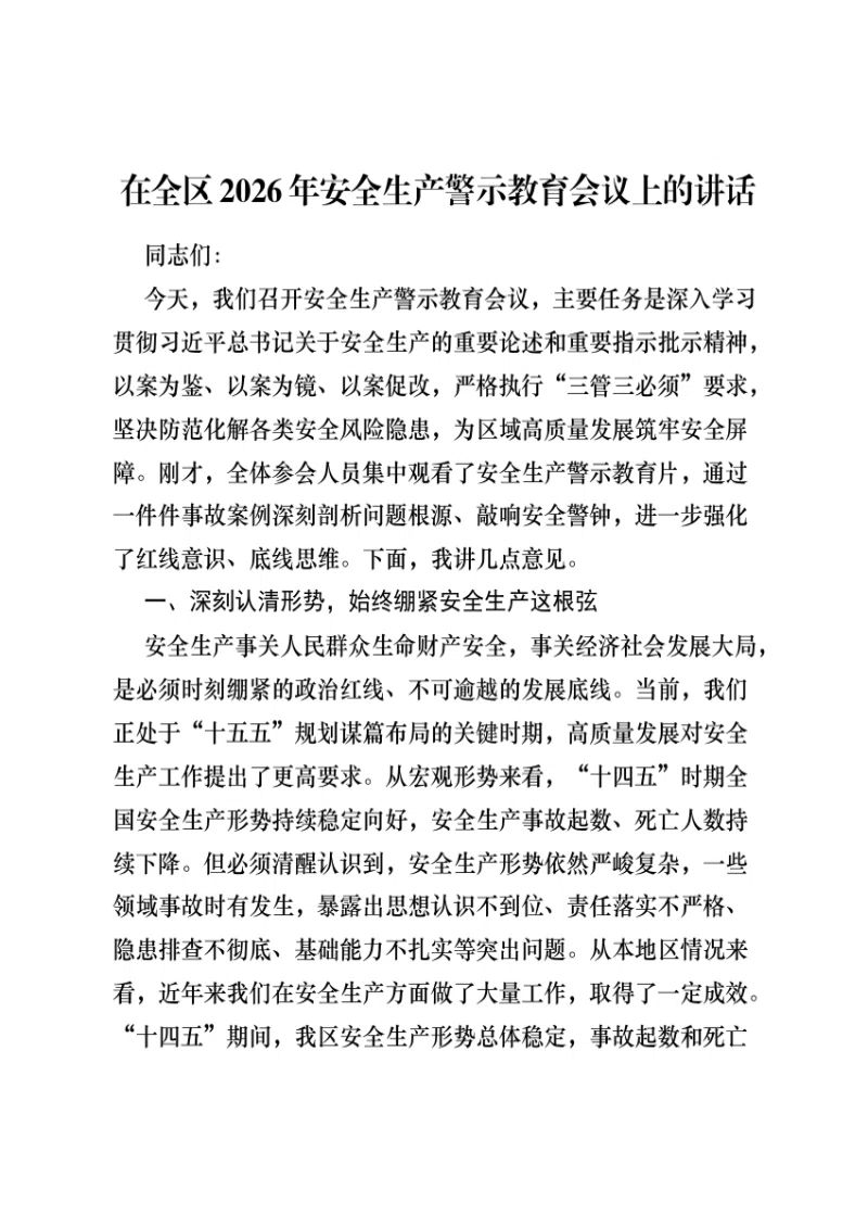 在全区2026年安全生产警示教育会议上的讲话同志们:今天,我们召开安全生产警示教育会议,主要任务是深入学习贯彻习近平总书记关于安全生产的重要论述和重要指示批示精神,以案为鉴、以案为镜、以案促改,严格执行“三管三必须”要求,坚决防范化解各类安全风险隐患,为区域高质量发展筑牢安全屏障。刚才,全体参会人员集中观看了安全生产警示教育片,通过一件件事故案例深刻剖析问题根源、敲响安全警钟,进一步强化了红线意识、底线思维。下面,我讲几点意见。一、深刻认清形势,始终绷紧安全生产这根弦安全生产事关人民群众生命财产安全,事关经济社会发展大局,是必须时刻绷紧的政治红线、不可逾越的发展底线。当前,我们正处于“十五五”规划谋篇布局的关键时期,高质量发展对安全生产工作提出了更高要求。从宏观形势来看,“十四五”时期全国安全生产形势持续稳定向好,安全生产事故起数、死亡人数持续下降。但必须清醒认识到,安全生产形势依然严峻复杂,一些领域事故时有发生,暴露出思想认识不到位、责任落实不严格、隐患排查不彻底、基础能力不扎实等突出问题。从本地区情况来看,近年来我们在安全生产方面做了大量工作,取得了一定成效。“十四五”期间,我区安全生产形势总体稳定,事故起数和死亡人数均呈下降趋势。但安全生产永远在路上,容不得丝毫麻痹大意。一些企业主体责任落实不力,安全投入不足,员工培训流于形式;一些部门监管执法宽松软虚,隐患排查浮于表面;一些行业领域基础薄弱,应急处置能力不强。这些问题不解决,安全生产就难以得到根本保障。全区上下要清醒认识当前安全生产形势的严峻性、复杂性,始终保持高度警觉,以居安思危、防患未然的行动自觉抓实抓细安全生产各项工作。一要强化政治意识,深入学习贯彻习近平总书记关于安全生产的重要论述,坚持人民至上、生命至上,统筹发展和安全,把安全生产作为重大政治任务抓紧抓好。二要强化忧患意识,深刻汲取各类事故教训,举一反三、引以为戒,坚决克服麻痹思想、侥幸心理、松劲心态。三要强化责任意识,严格落实“党政同责、“一岗双责”、齐抓共管、失职追责”要求,层层传导压力,级级压实责任。二、坚持警钟长鸣,深刻汲取事故教训警示教育片中展示的案例触目惊心、教训深刻。每一起事故背后都暴露出安全管理上的漏洞、责任落实上的缺失。我们必须认真对照、深刻反思、引以为戒。(一)要强化企业主要负责人第一责任人意识。企业法定代表人、实际控制人、实际负责人必须切实履行安全生产第一责任人职责,对本单位安全生产工作全面负责。要建立健全全员安全生产责任制,逐级逐岗明确安全责任,做到责任到人、措施到位。企业主要负责人要带头学习安全生产法律法规,带头开展安全检查,带头落实安全措施,真正把安全生产放在心上、抓在手上、扛在肩上。(二)要抓实企业内部警示教育与一线员工岗前培训。安全生产关键在人,核心在基层。要常态化开展警示教育,用身边事教育身边人,让每一个员工都知敬畏、存戒惧、守底线。要严格落实岗前培训制度,确保从业人员掌握本岗位的安全操作技能和应急处置知识,未经培训合格不得上岗作业。特殊工种作业人员必须持证上岗,严禁无证作业、违章作业。(三)要推动企业全面开展安全隐患自查自纠。企业要建立常态化隐患排查治理机制,定期组织安全检查,及时发现和消除隐患。对排查出的隐患要建立台账、分类治理、限期整改、闭环管理。要鼓励员工参与隐患排查,建立隐患报告奖励机制,调动全员参与安全生产的积极性。据统计,部分地区的工贸企业通过建立事故隐患内部报告奖励机制,累计查出隐患8800余个,有效发挥了员工在安全生产中的监督作用。三、夯实基层基础,健全完善安全生产制度体系基层基础是安全生产的根本保障。必须坚持系统观念、标本兼治,从制度、投入、队伍、培训等方面全面发力,夯实安全生产根基。(一)要健全完善安全生产制度体系,结合行业与企业实际细化操作规程。制度是安全生产的根本保障。要对照法律法规和标准规范,全面梳理现有安全管理制度,该修订的修订、该完善的完善、该新建的新建。要结合不同行业特点和企业实际,细化安全操作规程,做到每个岗位有规程、每项作业有标准、每个环节有要求。要强化制度执行,坚决杜绝制度写在纸上、挂在墙上、落不实到行动上的现象。(二)要配齐配强安全管理力量,足额保障安全生产投入,确保安全设施规范配备。人员配备到位、资金投入到位、设施配置到位是做好安全生产工作的基础条件。要按照规定配齐配强安全管理人员,确保安全工作有人抓、有人管、有人干。要足额提取和使用安全生产费用,保障安全设施设备购置、维护和更新改造的需要。要按照国家标准和行业规范配备安全设施设备,确保安全防护设施完好有效、安全警示标识清晰醒目、应急设备物资充足完备。(三)要常态化开展隐患排查治理,对隐患问题依法限期整改、闭环管理。隐患就是事故,必须把隐患排查治理作为日常工作的重中之重。要建立完善隐患