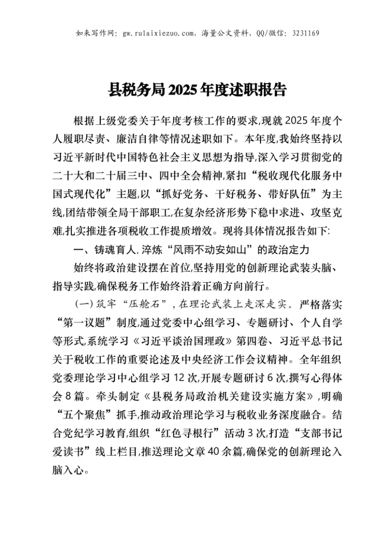 如来写作网:gw.rulaixiezuo.com,海量公文资料,QQ/微信:3231169县税务局2025年度述职报告根据上级党委关于年度考核工作的要求,现就2025年度个人履职尽责、廉洁自律等情况述职如下。本年度,我始终坚持以习近平新时代中国特色社会主义思想为指导,深入学习贯彻党的二十大和二十届三中、四中全会精神,紧扣“税收现代化服务中国式现代化”主题,以“抓好党务、干好税务、带好队伍”为主线,团结带领全局干部职工,在复杂经济形势下稳中求进、攻坚克难,扎实推进各项税收工作提质增效。现将具体情况报告如下:一、铸魂育人,淬炼“风雨不动安如山”的政治定力始终将政治建设摆在首位,坚持用党的创新理论武装头脑、指导实践,确保税务工作始终沿着正确方向前行。(一)筑牢“压舱石”,在理论武装上走深走实。严格落实“第一议题”制度,通过党委中心组学习、专题研讨、个人自学等形式,系统学习《习近平谈治国理政》第四卷、习近平总书记关于税收工作的重要论述及中央经济工作会议精神。全年组织党委理论学习中心组学习12次,开展专题研讨6次,撰写心得体会8篇。牵头制定《县税务局政治机关建设实施方案》,明确“五个聚焦”抓手,推动政治理论学习与税收业务深度融合。结合党纪学习教育,组织“红色寻根行”活动3次,打造“支部书记爱读书”线上栏目,推送理论文章40余篇,确保党的创新理论入脑入心。(二)把稳“方向盘”,在政治忠诚上见行见效。扎实开展“深入贯彻中央八项规定精神”专项活动,组织全局干部参观廉政教育基地4次,召开警示教育大会3次,通报典型案例12起。严格执行重大事项请示报告制度,全年向市局党委和县委、县政府报告重点工作16次。修订《县税务局公务接待管理办法》等5项制度,压缩公务支出同比降低8%。在减税降费、组织收入等关键工作中,主动对标中央和省委要求,确保政令畅通、执行有力。(三)激活“一池水”,在思想引领上求新求变。实施“青年干部赋能计划”,通过“师徒结对”“岗位练兵”培养青年骨干15名,其中3人在市级业务竞赛中获奖。创新开展“税月清风”微党课比赛,拍摄廉政微电影《税月清风》在全局展播。结合2025年数字税务建设要求,搭建“云端学习平台”,推送政策解读视频30期,覆盖干部600余人次,全面提升政治素养与业务能力。二、履职尽责,扛起“功成必定有我”的税务担当紧扣税收主责主业,坚持稳中求进工作总基调,推动组织收入、征管改革、纳税服务等重点工作落地见效。(一)在组织收入上“量质齐升”。面对经济下行压力,坚持依法征收、应收尽收,全年组织各项税收收入亿元,同比增长%,其中县级收入亿元,完成年度任务的105%。加强税源监控,对年纳税额100万元以上的企业实行“一户一策”管理,动态跟踪重点项目建设税收情况,清缴欠税1200万元。推行“税收风险防控清单”制度,提前识别化解风险点28个,确保收入质量稳中有升。(二)在征管改革上“破立并举”。深化税收征管改革,全面推广“金税四期”系统,实现主要税种数字化管理覆盖率100%。创新“信用+风险”监管模式,对A级纳税人提供绿色通道服务,对D级纳税人实施重点稽查,全年稽查补税3800万元,同比增长15%。推进“非接触式”办税,网上办税率达92%,同比提升5个百分点;推广电子发票覆盖小微企业1.2万户,减少纸质发票使用量30%。(三)在纳税服务上“温心贴心”。开展“便民办税春风行动”,落实减税降费政策,全年为小微企业减免税费万元。创新“青年导税员”制度,提供全程导税服务500余次,纳税人满意度测评达98.5%。建立“税费争议调解室”,化解征纳矛盾12起,实现“零投诉”。联合银行推行“银税互动”,为守信企业提供贷款1.2亿元,助力营商环境优化。三、廉洁自律,永葆“只留清气满乾坤”的政治本色严格落实全面从严治党主体责任,带头遵守廉洁纪律,营造风清气正的政治生态。(一)扎紧“制度笼子”。修订《县税务局内部控制管理办法》,细化廉政风险点防控措施35条,每季度开展内控检查通报。严格执行“三重一大”集体决策制度,全年召开党委会24次,研究重大项目、资金使用等事项均集体讨论、全程记录。开展“家庭助廉”活动,组织干部家属签订廉洁承诺书120份,筑牢家庭防线。(二)筑牢“防火墙”。紧盯节假日关键节点,发送廉政提醒短信800余条,开展明察暗访6次,严防“四风”问题反弹。本人带头拒收礼金、礼品3次,全局无干部因廉洁问题被查处。结合2025年中央八项规定精神深化学习要求,组织“以案促改”专题讨论4次,推动廉洁教育常态化。(三)拧紧“思想阀”。将廉洁教育纳入干部培训必修课,落实谈心谈话制度,与班子成员、中层干部谈话提醒30人次,对苗头性问题早预警、早纠正。开展“廉洁文化进分局”活动,打造廉政长廊2处,通过典型案例剖析、廉政故事分享等方式,增强干部拒腐防变能力。四、存在的问题