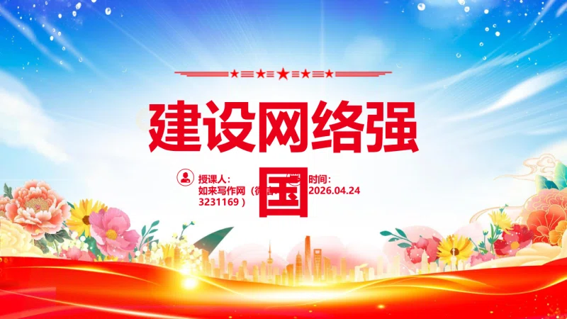 版权声明感谢您下载如来写作网平台上提供的PPT作品,为了您和如来写作网以及原创作者的利益,请勿复制传播、销售,否则将承担法律责任!如来写作网将对作品进行维权,按照传播下载次数进行十倍的索取赔偿!1.在如来写作网出售的PPT模板是免版税类(RF:Royalty-Free)正版受《中华人民共和国著作权法》和《世界版权公约》的保护,作品的所有权、版权和著作权归如来写作网所有,您下载的PPT模板素材的使用权。2.不得将如来写作网的PPT模板、PPT素材,本身用于再出售,或者出租、出借、转让、分销、发布或者作为礼物供他人使用,不得转授权、出卖、转让本协议或者本协议中的权利。更多精品PPT模板:gw.rulaixiezuo.com建设网络强国授课人:如来写作网(微信:3231169)时间:2026.04.24前言习近平总书记高度重视网络强国建设,2016年4月19日,习近平总书记主持召开网络安全和信息化工作座谈会并发表重要讲话,意义重大、影响深远。党的十八大以来,习近平总书记围绕网络强国建设发表一系列重要论述,提出一系列新思想新观点新论断,为新时代网信事业发展提供了根本遵循。不断提高运用网络了解民意、开展工作的能力[第一部分]要在党中央集中统一领导下,健全网络综合治理格局,形成治理合力。各级各部门要强化管网治网的政治责任和领导责任,及时有效解决突出问题,不断提高运用网络了解民意、开展工作的能力。不断提高运用网络了解民意、开展工作的能力——2025年11月,在二十届中央政治局第二十三次集体学习时的讲话我多次讲过,过不了互联网这一关,就过不了长期执政这一关。不断提高运用网络了解民意、开展工作的能力——2024年10月,在二十届中央政治局第十七次集体学习时的讲话要以新时代中国特色社会主义思想为指导,全面贯彻落实党的二十大精神,深入贯彻党中央关于网络强国的重要思想,切实肩负起举旗帜聚民心、防风险保安全、强治理惠民生、增动能促发展、谋合作图共赢的使命任务,坚持党管互联网,坚持网信为民,坚持走中国特色治网之道,坚持统筹发展和安全,坚持正能量是总要求、管得住是硬道理、用得好是真本事,坚持筑牢国家网络安全屏障,坚持发挥信息化驱动引领作用,坚持依法管网、依法办网、依法上网,坚持推动构建网络空间命运共同体,坚持建设忠诚干净担当的网信工作队伍,大力推动网信事业高质量发展,以网络强国建设新成效为全面建设社会主义现代化国家、全面推进中华民族伟大复兴作出新贡献。不断提高运用网络了解民意、开展工作的能力——2023年,对网络安全和信息化工作作出重要指示中央网络安全和信息化领导小组要发挥集中统一领导作用,统筹协调各个领域的网络安全和信息化重大问题,制定实施国家网络安全和信息化发展战略、宏观规划和重大政策,不断增强安全保障能力。不断提高运用网络了解民意、开展工作的能力——2014年2月,在中央网络安全和信息化领导小组第一次会议上的讲话网信事业发展必须贯彻以人民为中心的发展思想[第二部分]加快信息化服务普及,缩小数字鸿沟,在互联网发展中保障和改善民生,让更多国家和人民共享互联网发展成果。网信事业发展必须贯彻以人民为中心的发展思想——2023年11月,向2023年世界互联网大会乌镇峰会开幕式发表视频致辞要探索“区块链+”在民生领域的运用,积极推动区块链技术在教育、就业、养老、精准脱贫、医疗健康、商品防伪、食品安全、公益、社会救助等领域的应用,为人民群众提供更加智能、更加便捷、更加优质的公共服务。网信事业发展必须贯彻以人民为中心的发展思想——2019年10月,在十九届中央政治局第十八次集体学习时的讲话网信事业发展必须贯彻以人民为中心的发展思想,把增进人民福祉作为信息化发展的出发点和落脚点,让人民群众在信息化发展中有更多获得感、幸福感、安全感。网信事业发展必须贯彻以人民为中心的发展思想——2018年4月,在全国网络安全和信息化工作会议上的讲话共建网上美好精神家园[第三部分]网络乱象污染社会风气,侵犯群众利益,要敢于亮剑、坚决打击,切断利益链和产业链,铲除其滋生的土壤和条件。要结合打击网络乱象,深入查找网络生态治理的薄弱环节,采取针对性措施固根基、补短板。共建网上美好精神家园——2025年11月,在二十届中央政治局第二十三次集体学习时的讲话各级党委和政府要担当责任,网络平台、社会组织、广大网民等要发挥积极作用,共同推进文明办网、文明用网、文明上网,以时代新风塑造和净化网络空间,共建网上美好精神家园。共建网上美好精神家园——2021年11月,致首届中国网络文明大会的贺信网络空间是亿万民众共同的精神家园。网络空间天朗气清、生态良好,符合人民利益。网络空间乌烟瘴气、生态恶化,不符合人民利益。共建网上美好精神家园——2016年4月,在网络安全和信息化工作座谈会上的讲话没有网络安全就没有国家