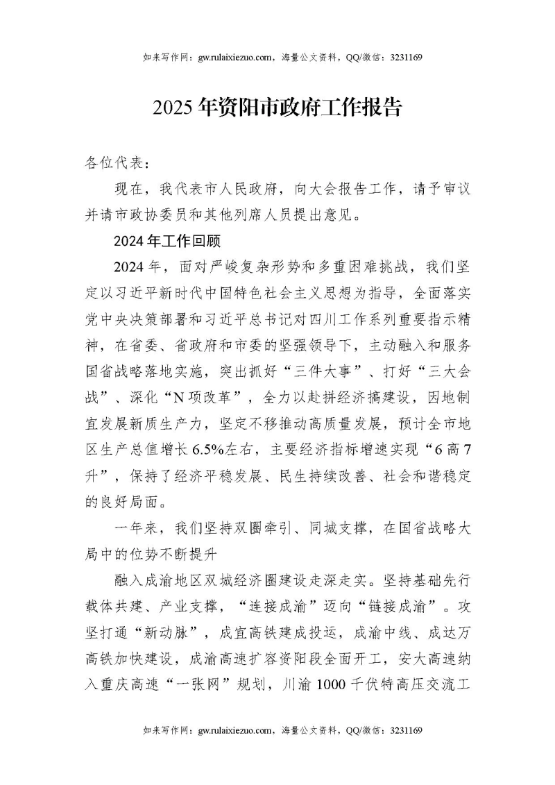 2025年资阳市政府工作报告
